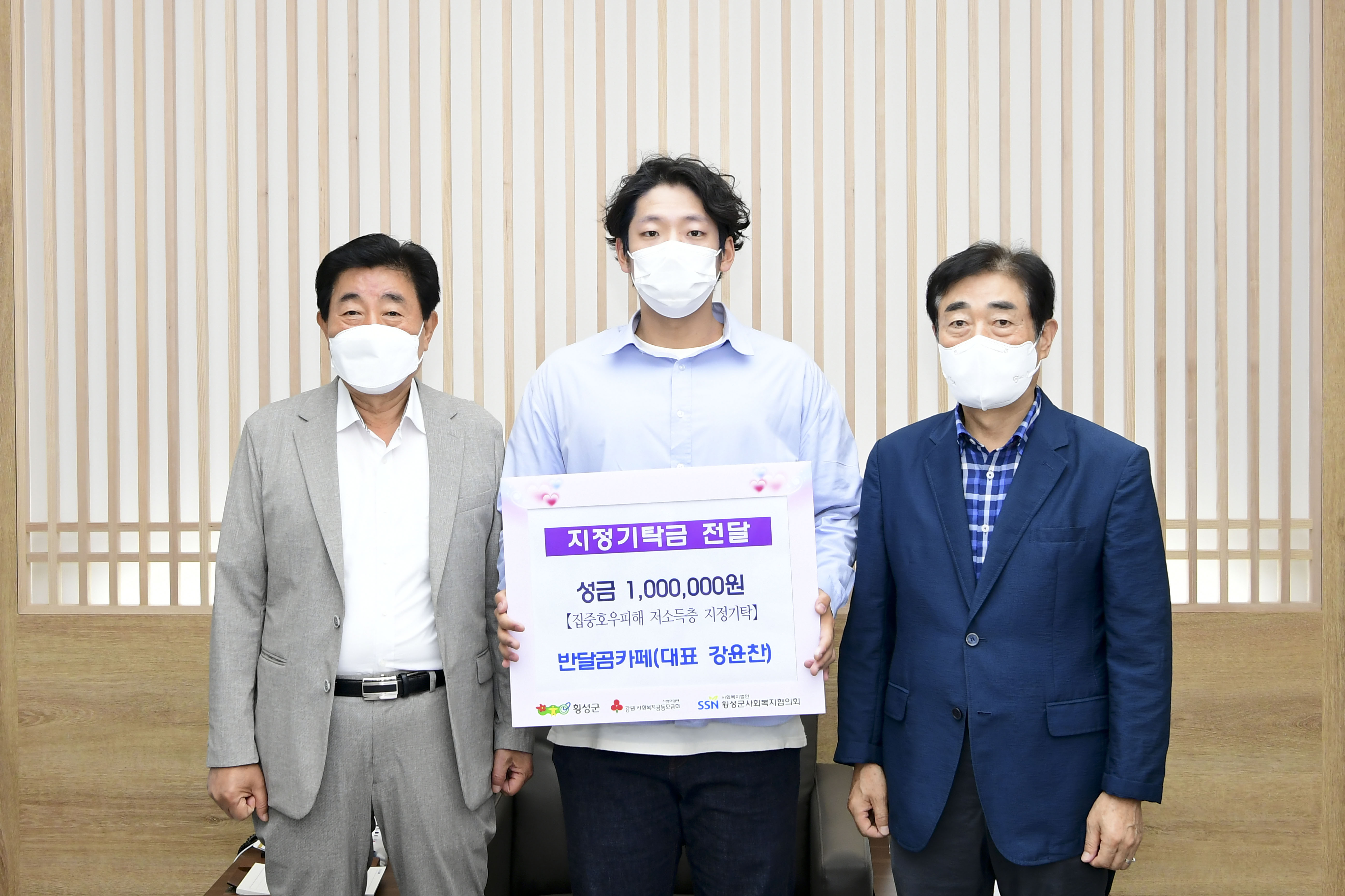 [강원사회복지신문 홍기한 기자]=반달곰카페(대표 강윤찬)는 지난 8월 16일 오전 9시 30분, 군수 집무실을 방문하여 집중호우 피해를 입은 관내 저소득층을 위하여 성금 1,000천원을 지정기탁했다. 이날 전달식에는 김명기 횡성군수, 이석원 횡성군사회복지협의회장, 강윤찬 대표가 참석하였다. 강윤찬 대표는 "횡성읍에서 카...