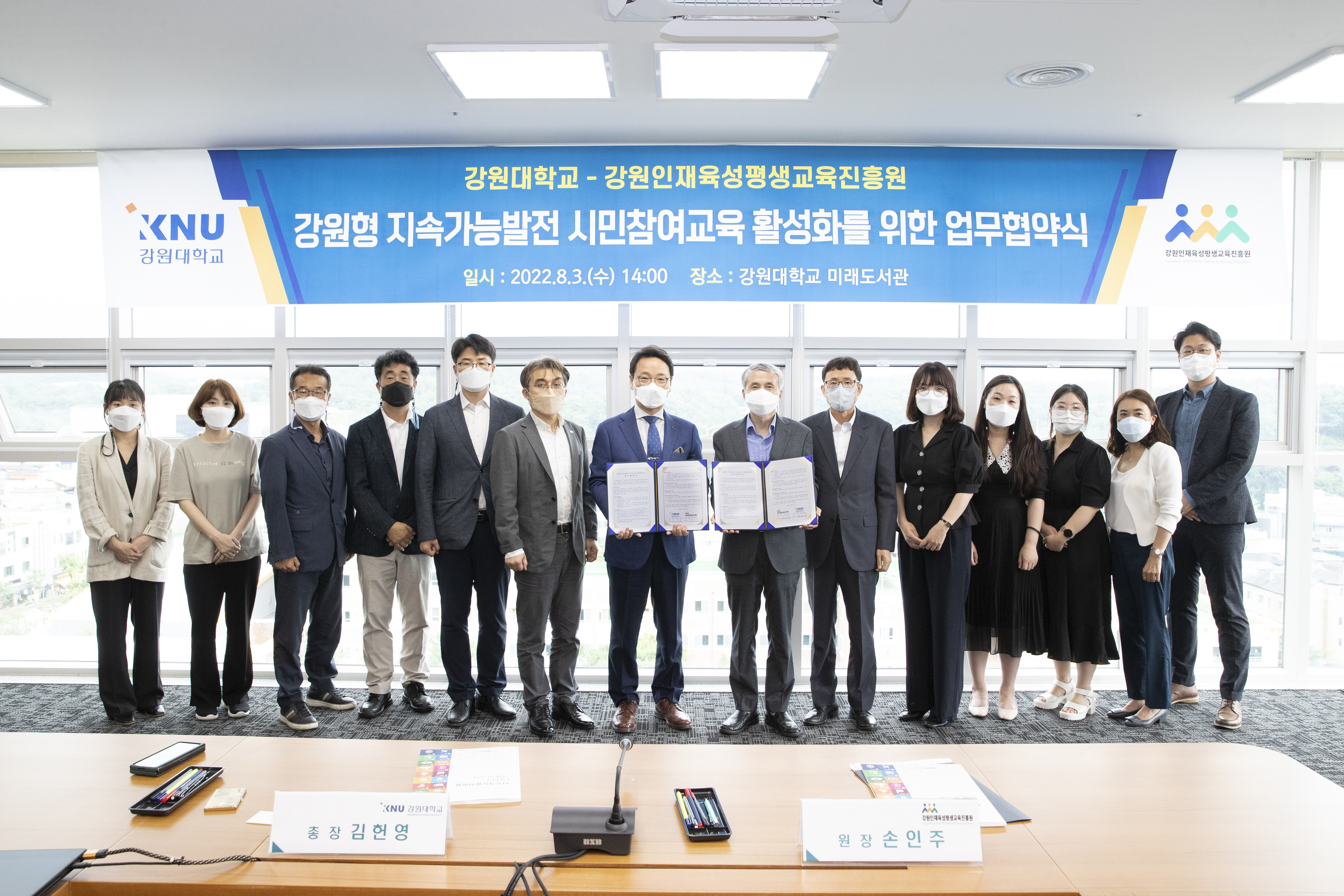 [강원사회복지신문 홍기한 기자]=강원인재육성평생교육진흥원(원장 손인주)과 강원대학교(총장 김헌영)는 지난 8월 3일(수) 오후 2시 KNU미래도서관 대회의실에서 '강원형 지속가능발전 시민참여교육 활성화 업무협약'을 체결했다. 이번 협약식에는 손인주 강원인재육성평생교육진흥원장과 김헌영 총장을 비롯해 양 기관 관계...