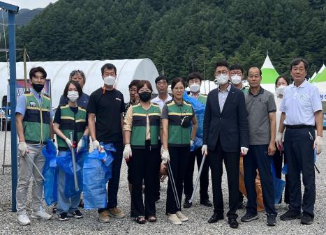 [강원사회복지신문 김종한 기자]=평창군 대화면사무소(면장 김재봉) 직원 및 대화면이장협의회(회장 김시종) 등 20여 명은 지난 8월 2일 오후 6시 2022 평창더위사냥축제가 한창인 축제장 일원에서 제초작업·쓰레기 수거 등 쾌적한 관광환경 조성을 위해 봉사활동을 실시했다.