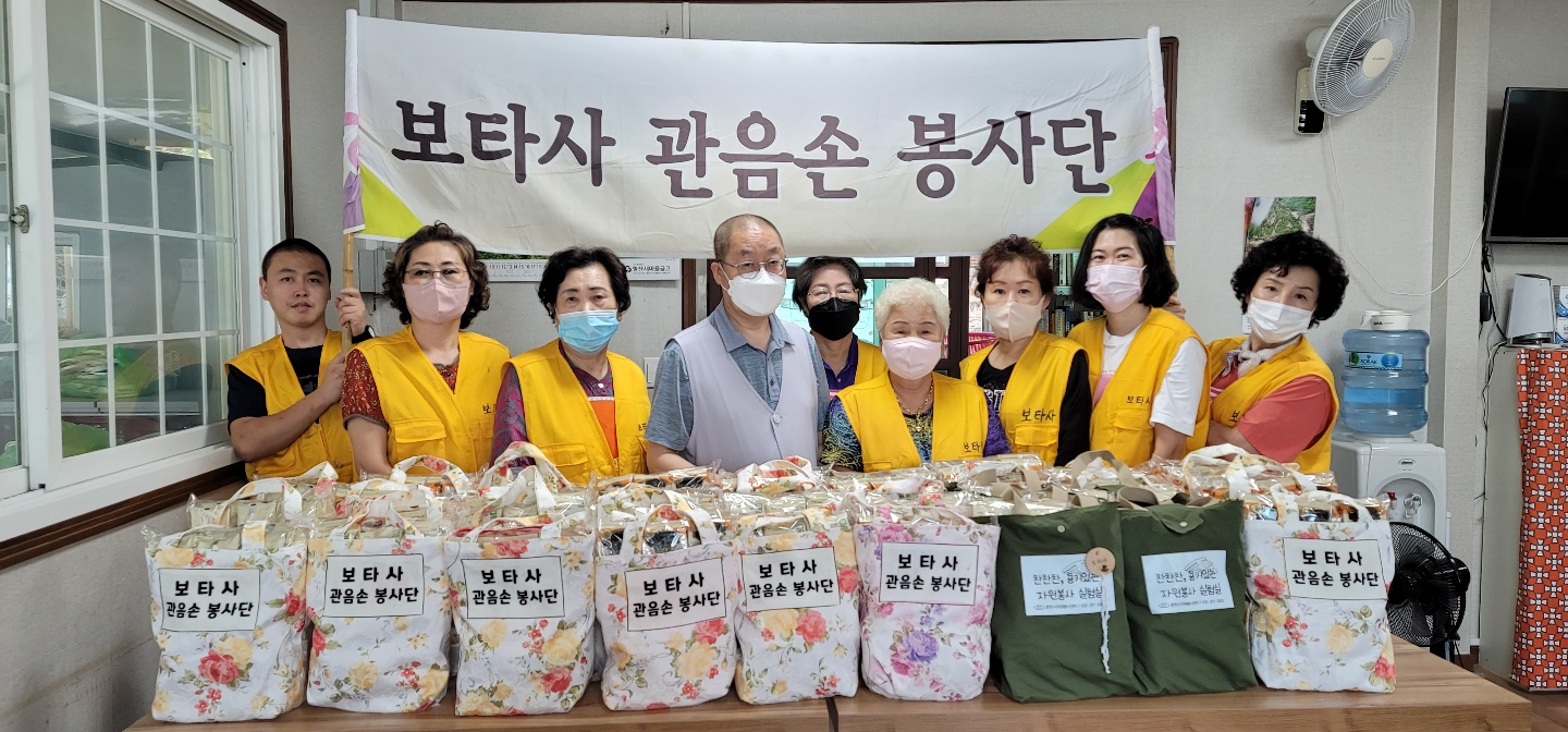 [강원사회복지신문 홍기한 기자]=보타사 관음손 봉사단(단장:양영석, 주지:진철스님, 부단장:이옥희)은 지난 7월 28일 식사 준비에 어려움을 겪고 있는 춘천시 관내 독거어르신 및 중증장애인 36가구에 직접 만든 소고기 불고기, 오이무침, 감자볶음, 김을 전달했다.