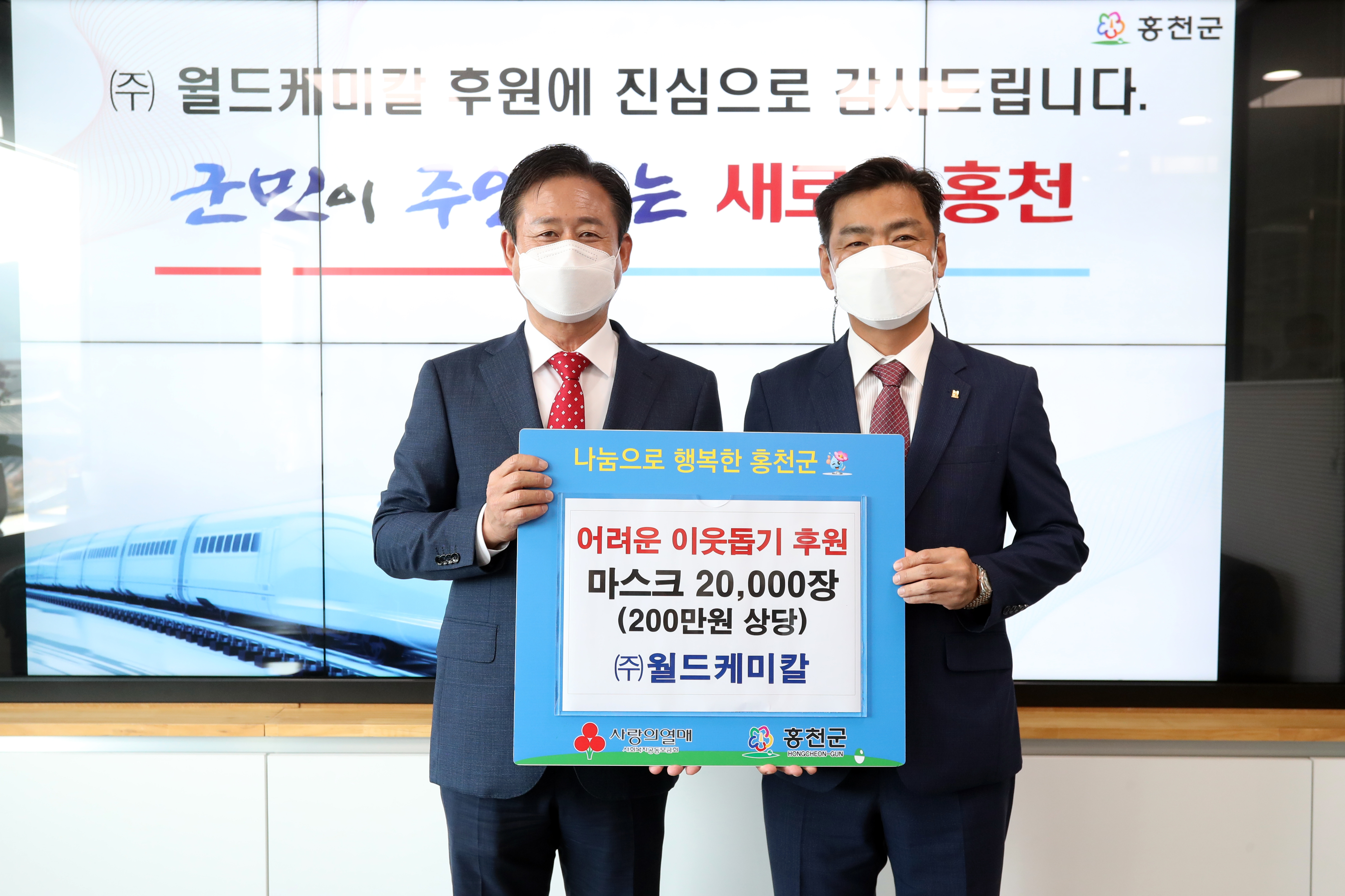 [강원사회복지신문 홍기한 기자]=(주)월드케미칼(대표 박재희)은 지난 7월 26일 홍천군청을 방문, 어려운 이웃들에게 전달할 200만원 상당의 마스크 2만장을 기탁했다. 박재희 대표는 "최근 코로나19 확진자수가 계속 증가하고 있어 걱정"이라며 "어려운 이웃에게 조금이나마 도움이 될 수 있기를 바란다"고 말했다. 신영재 ...