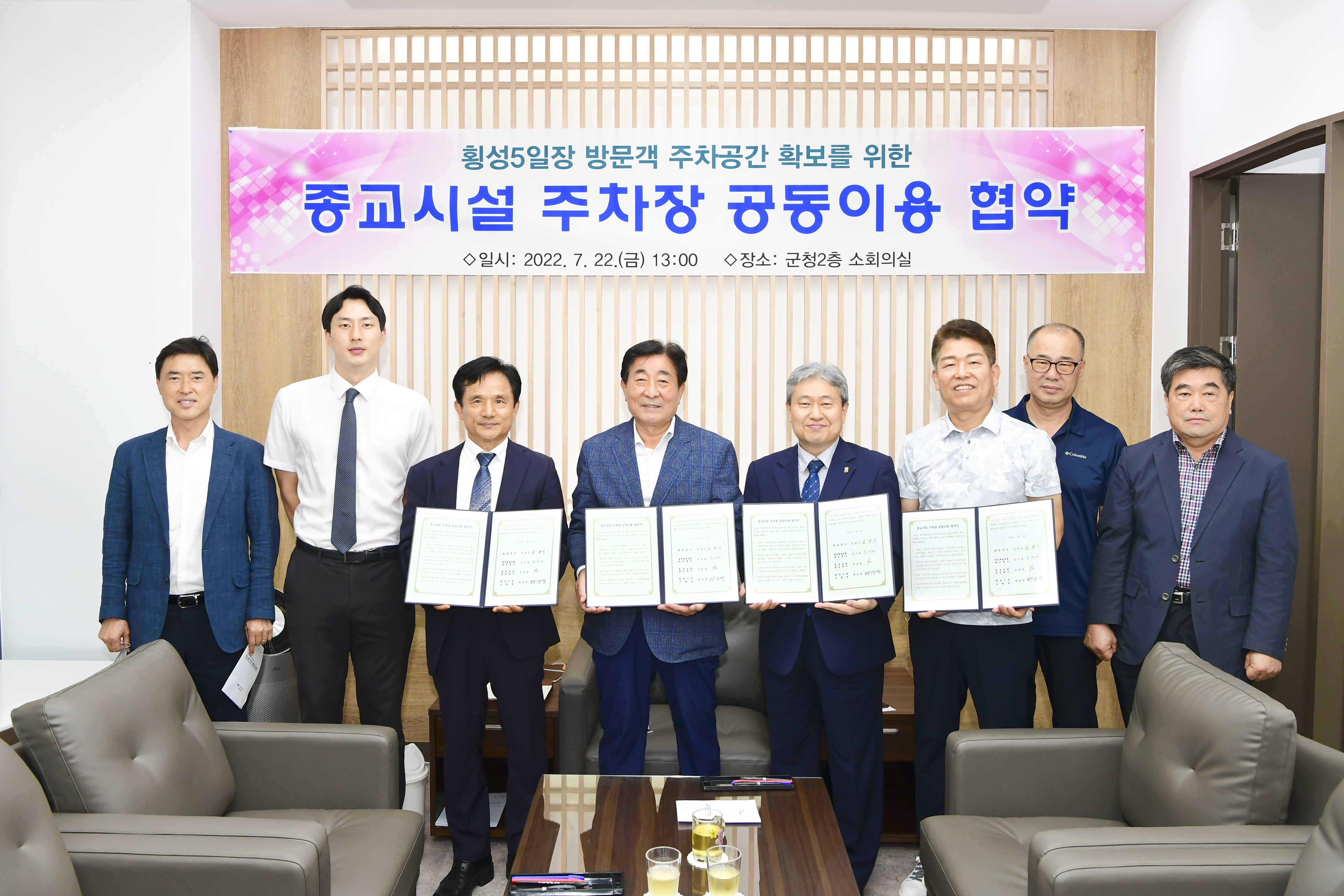 [강원사회복지신문 홍기한 기자]=5일장 주차난 해소위해, 횡성교회와 횡성제일교회 주차장 90면 개방 횡성군은 횡성5일장 주차난 해소를 위해 횡성시장 인근지역 교회 주차장을 무료로 개방하는 '횡성군 종교시설 주차장 공동이용 협약식'을 지난 7월 22일, 오후 1시 군청 2층 소회의실에서 개최했다. 이날 협약식에는 김명기...