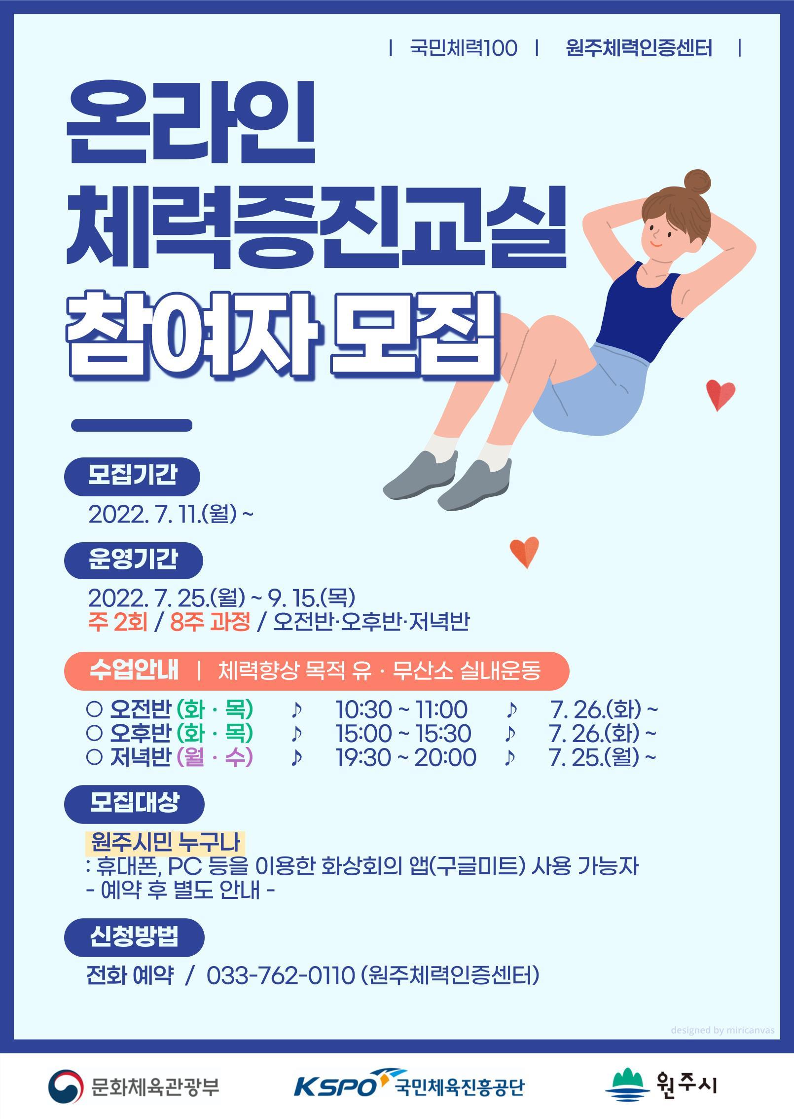 [강원사회복지신문 홍기한 기자]=주 2회 8주 온라인 과정, 오전·오후·저녁반 각 선착순 50명 모집 국민체력100 원주체력인증센터가 무더위에 지친 시민의 체력향상 도모를 위해 온라인 체력증진교실 참여자를 모집한다. 건강운동관리사가 함께하는 이 프로그램은 화상회의 앱 '구글 미트(Google Meet)'를 활용해 7월 25일부...