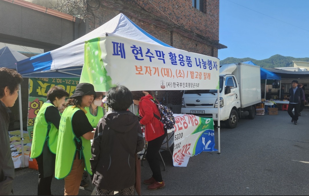 [강원사회복지신문 김종한 기자]=(사)한국부인회 평창군지회에서는 평창군에서 시행하는 '2023년 폐현수막 재활용사업'에 참여하여 폐현수막을 재활용한 물품을 만들어 무료로 나누어 주는 행사를 지난 10월 5일(목) 평창읍 전통시장 5일장에서 진행하였다. 나눔 물품은 밭이랑 덮개, 농업용 보자기 등의 주로 농가에서 사용...