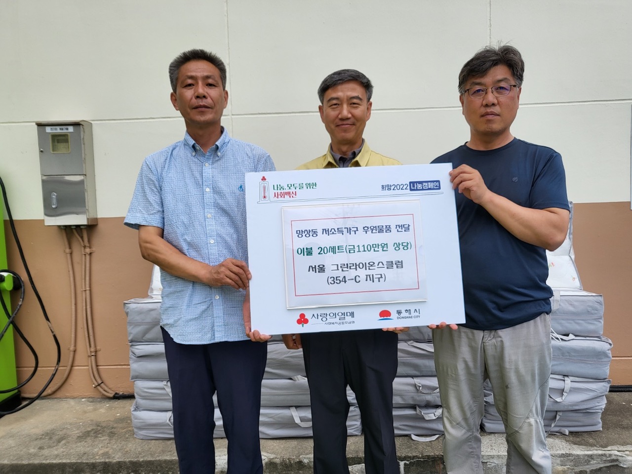 [강원사회복지신문 김종한 기자]=서울 그린라이온스클럽 354-C지구(회장: 박영미)에서 지난 6월 29일 하절기를 맞아 동해시 망상동 저소득가구에 전달해 달라며 110만원 상당의 여름 이불 20세트를 기탁했다. 기탁받은 이불세트는 복지대상자로 생계가 어려운 관내 20가구에 전달될 예정이다.