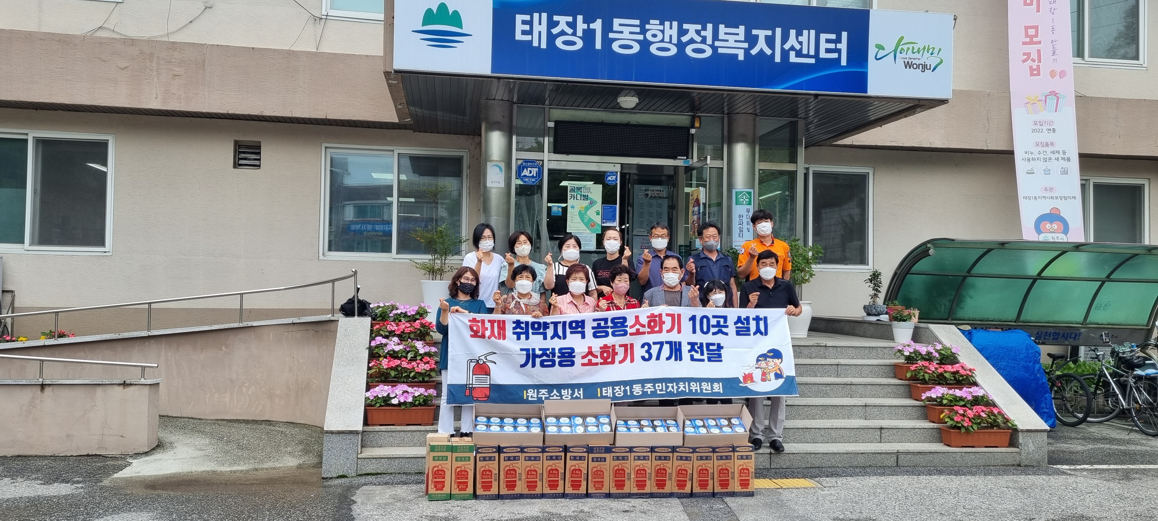 [강원사회복지신문 서은진 기자]=원주시 태장1동 주민자치위원회(위원장 고영식)와 원주소방서(서장 김용한)은 지난 6월 29일 새동네 및 육판길 일원에 거주하는 독거노인·저소득 45가구에 가정용 소화기와 감지기를 무료로 배부했다. 5월에 이어 2차로 진행한 소방시설 배부는 화재 취약지역 및 계층의 인명피해 저감과 안...