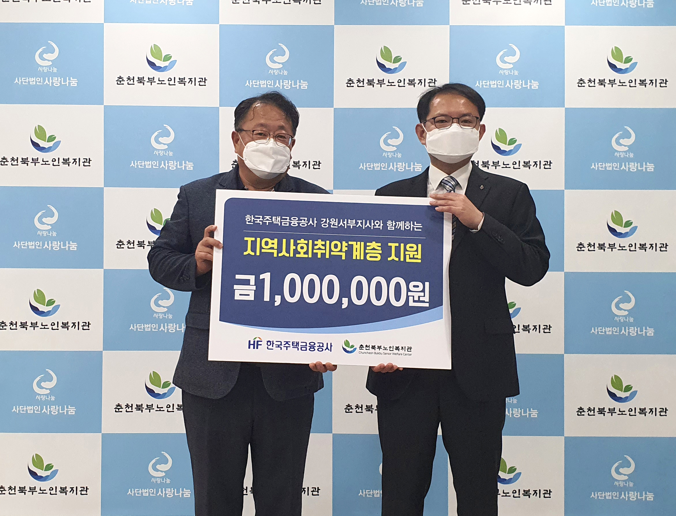 [강원사회복지신문 이정환 기자]=한국주택금융공사 강원서부지사(지사장 전경환)는 지난 6월 23일(목), 춘천북부노인복지관(관장 박재호)에 지역사회 취약계층 지원을 위한 후원금(금1,000,000원)을 전달하였다. 한국주택금융공사 강원서부지사는 2017년 춘천북부노인복지관 개관 이래 매년 지역사회 소외계층 지원을 위해 후...