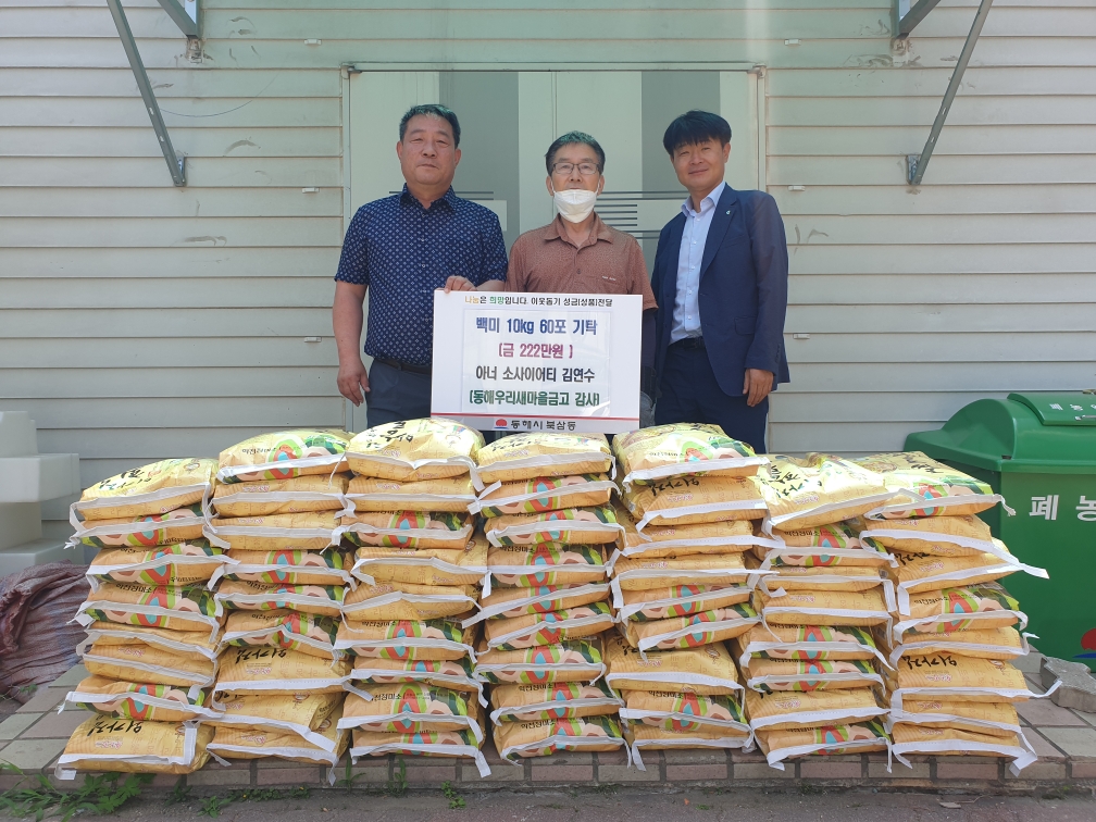 [강원사회복지신문 김종한 기자]=동해시 아너 소사이어티 김연수(고려쌀유통 대표) 회원은 지난 6월 20일 원주시 북삼동행정복지센터를 방문해 어려운 이웃을 위한 222만원 상당의 백미10kg 60포를 기탁했다. 아너 소사이어티는 1억원 이상을 기부하거나 납부를 약정한 개인 고액 기부자들의 모임으로 사회문제에 대한 관심을...