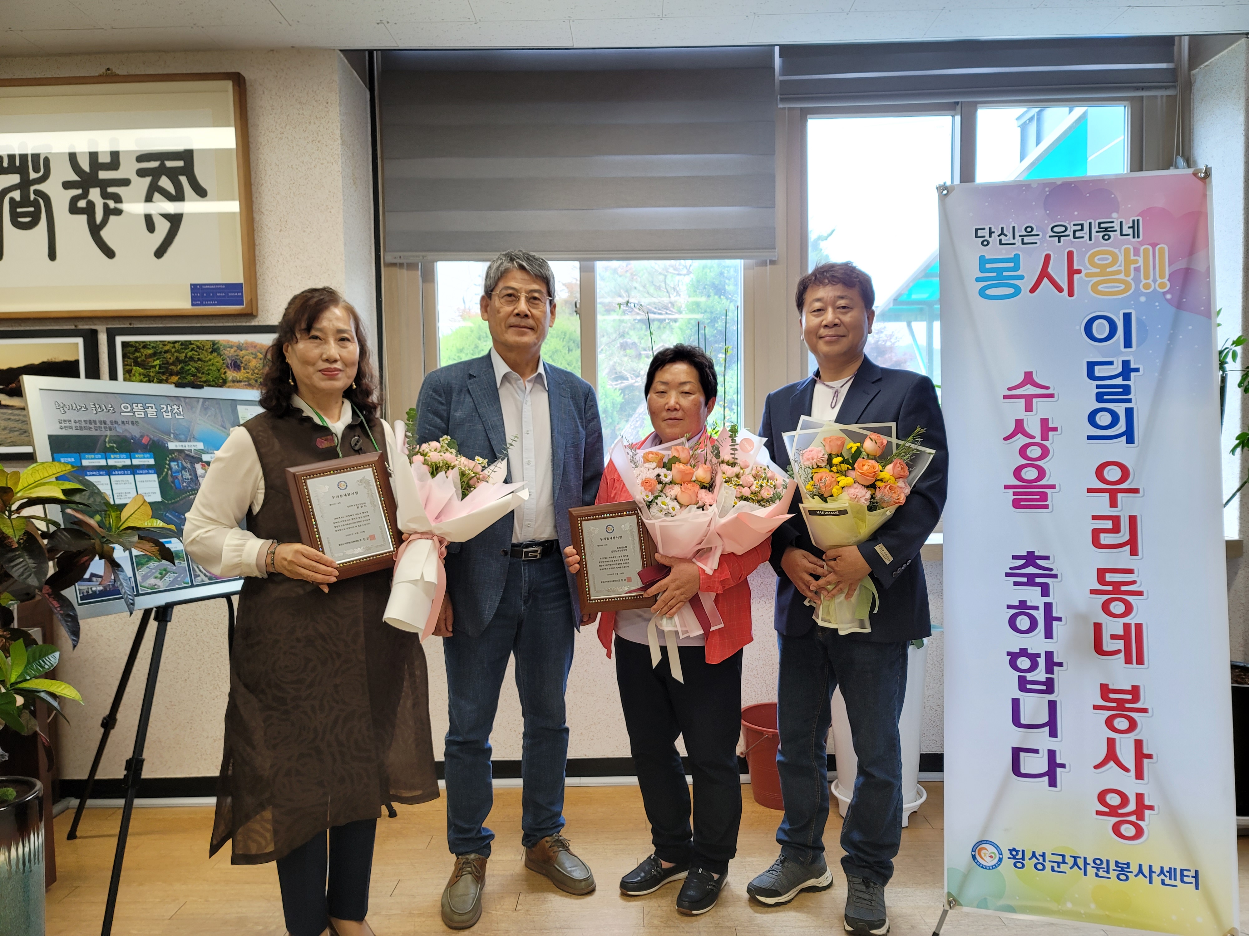 [강원사회복지신문 홍기한 기자]=횡성군자원봉사센터(센터장 조원문)는 6월 우리동네봉사왕(갑천면)에 개인으로 원선자 봉사자, 단체로는 동횡성농협 갑천농가주부모임을 선정하여 지난 6월 20일(월) 갑천면행정복지센터에서 시상식을 가졌다. 개인으로 선정된 원선자 봉사자는 취약계층 어르신들 대상으로 이동세탁 지원과 ...