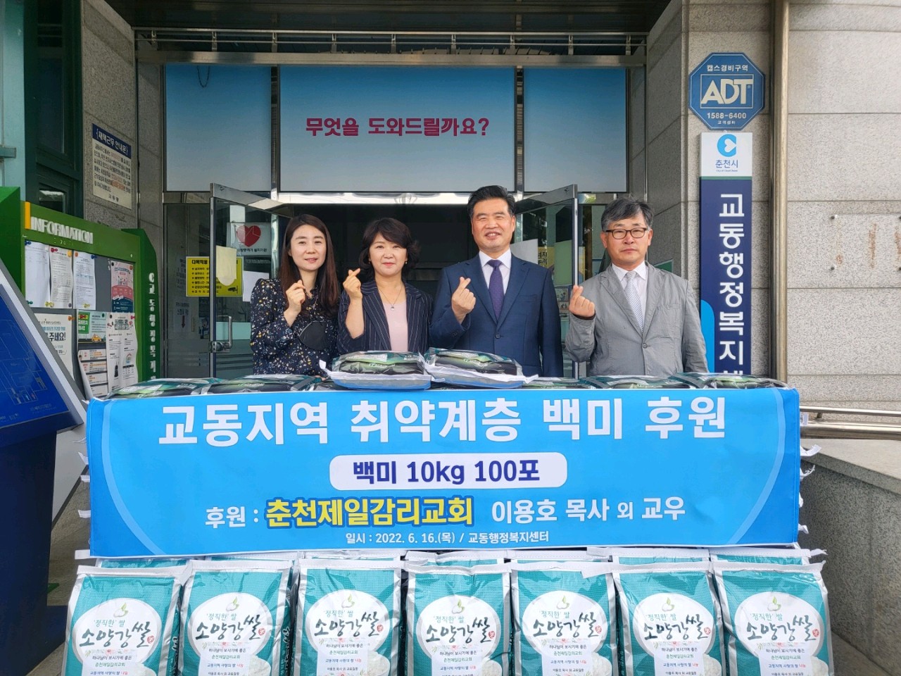 [강원사회복지신문 서은진 기자]=춘천제일감리교회(목사:이용호)는 지난 6월 16일 관내 돌봄이 필요한 취약계층 가구에 전달해달라며 백미10㎏ 100포를 교동행정복지센터(동장: 김춘옥)에 전달했다.