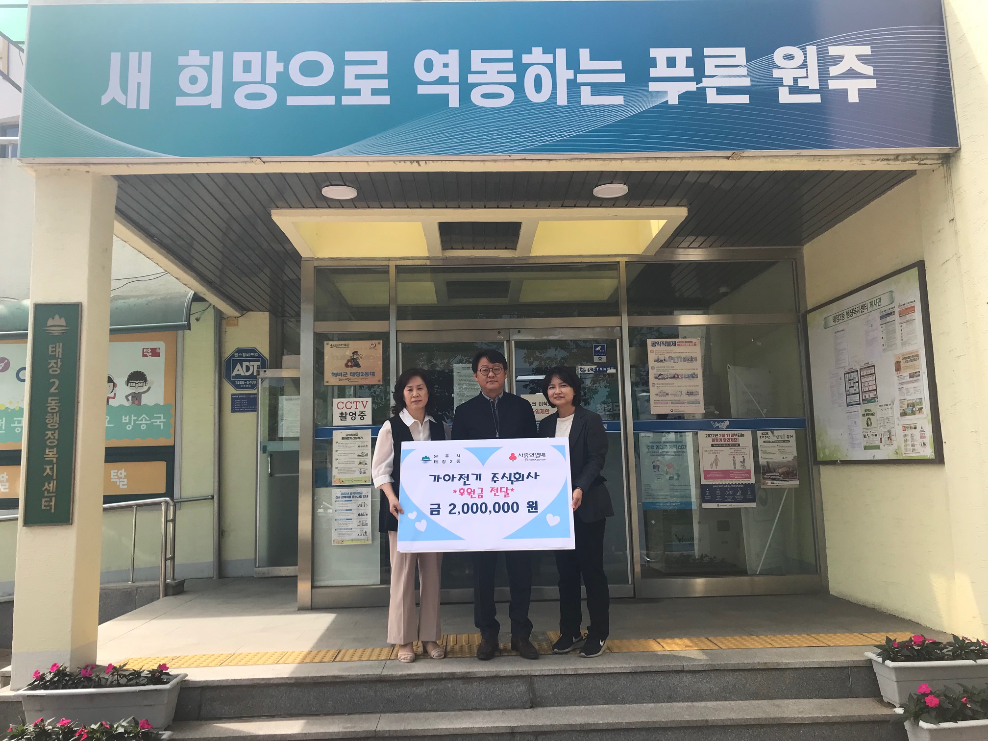 [강원사회복지신문 서은진 기자]=원주시 태장2동 가아전기주식회사(대표 최대식)는 지난 6월 14일 태장2동 행정복지센터를 방문해 어려운 이웃 돕기 성금 200만 원을 전달했다. 최대식 대표는 "코로나19 장기화와 경기침체로 모두가 힘든 시기를 보내고 있다."라며, "주변의 이웃들이 어려움을 극복하는 데 작은 보탬이 되고...