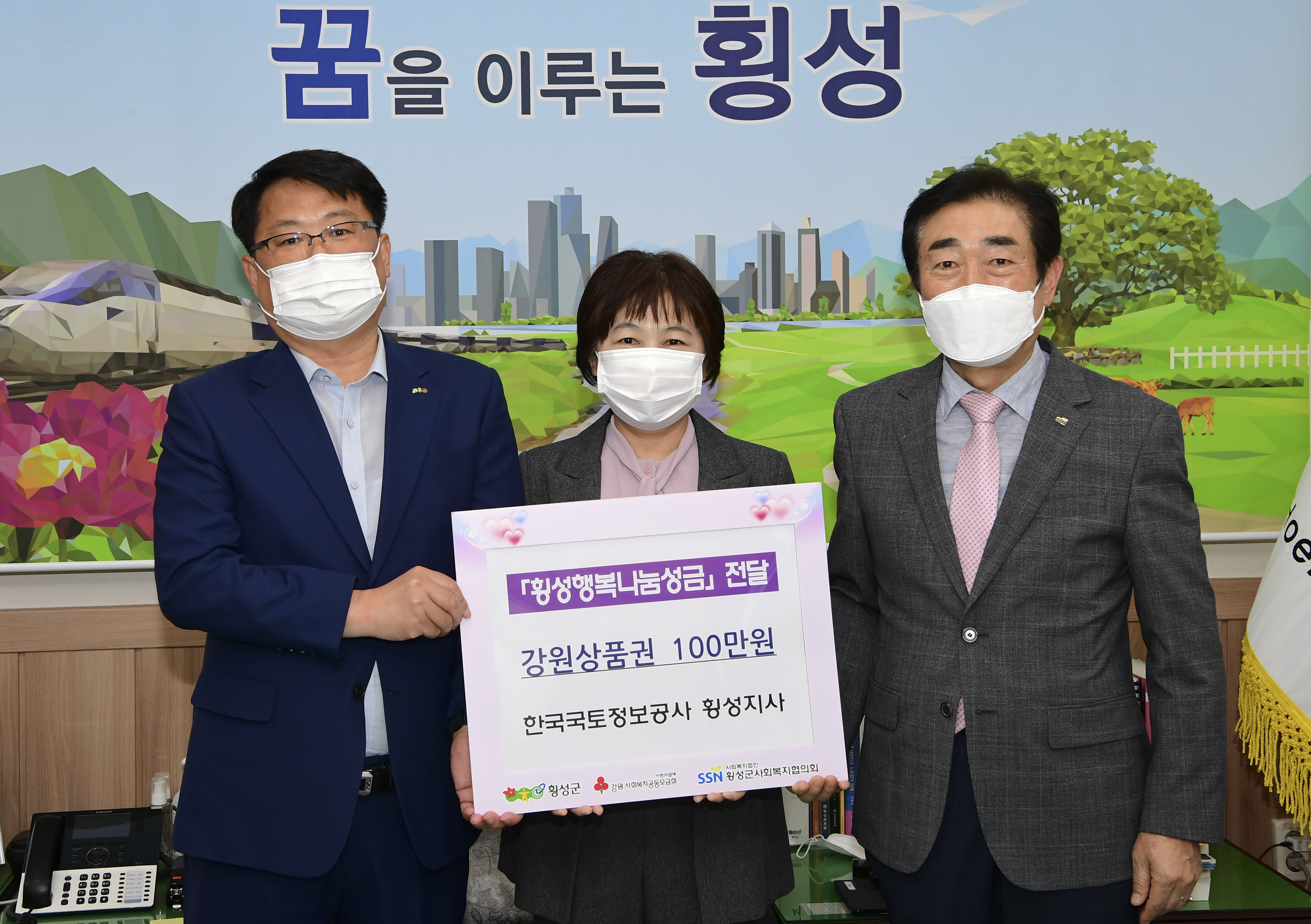 [강원사회복지신문 홍기한 기자]=한국국토정보공사 횡성지사(지사장 강장화)는 지난 5월 11일 오후 4시, 부군수집무실을 방문하여 '횡성행복나눔성금'에 강원상품권 100만원을 기탁했다. 이날 전달식에는 한국국토정보공사 횡성지사 강장화 지사장이 참석했다. 전달된 상품권은 횡성군 관내 저소득층 및 취약계층을 돕는 데 ...