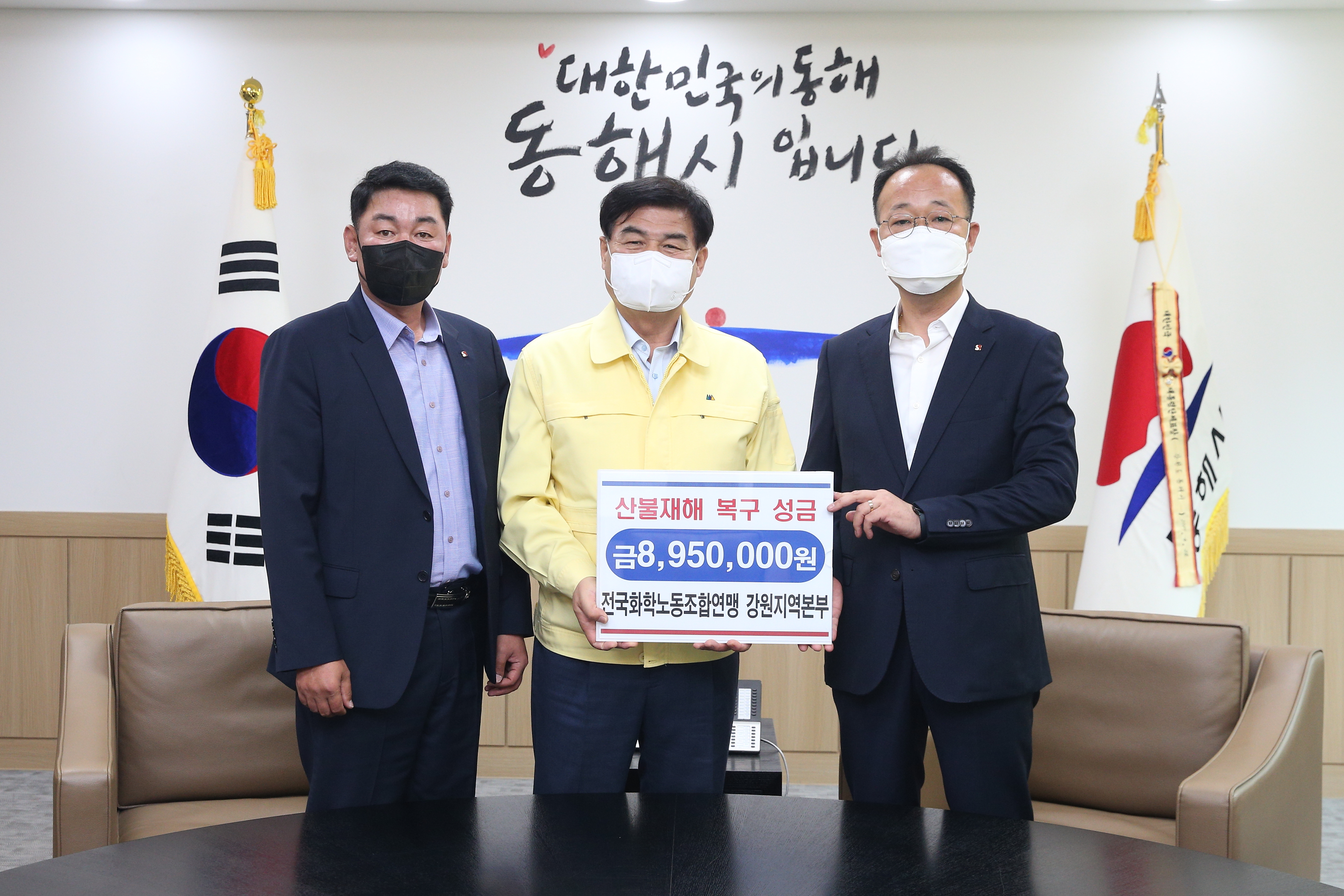 [강원사회복지신문 김종한 기자]=전국화학노동조합연맹 강원지역본부는 지난 5월 3일 산불재해 복구를 위해 사용해 달라며 8,950,000원의 성금을 동해시에 전달했다.