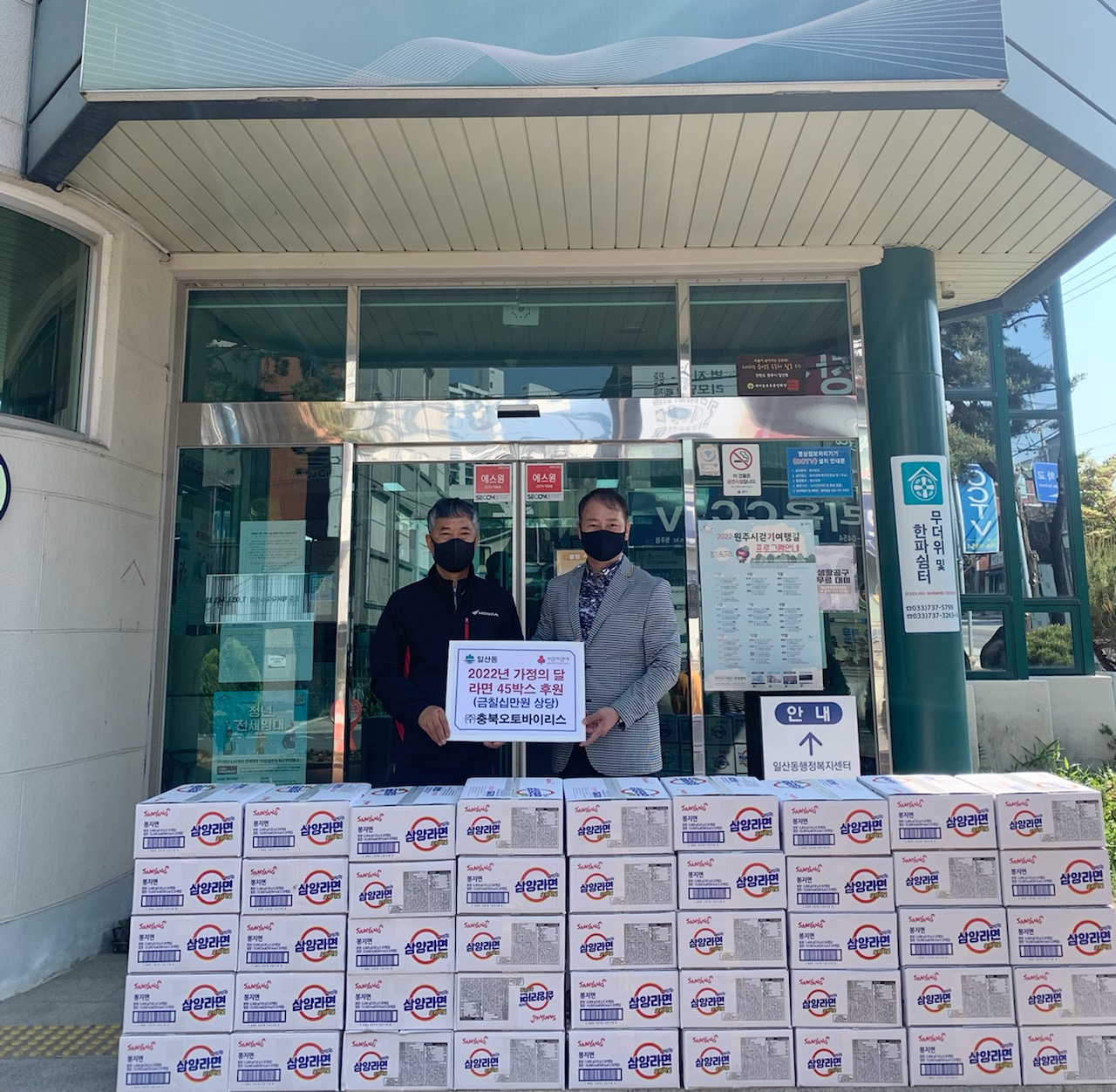 [강원사회복지신문 서은진 기자]=충북오토바이(대표 이현종)는 지난 5월 3일 원주시 일산동 행정복지센터를 방문해 저소득 가구를 위해 가정의 달 맞이 이웃사랑 라면 45박스를 전달했다. 이현종 대표는 "이번 나눔이 코로나19로 더욱 어려운 시기를 보낸 이웃들에게 잘 전해져 함께 따뜻한 봄을 맞이할 수 있길 바란다."라고...