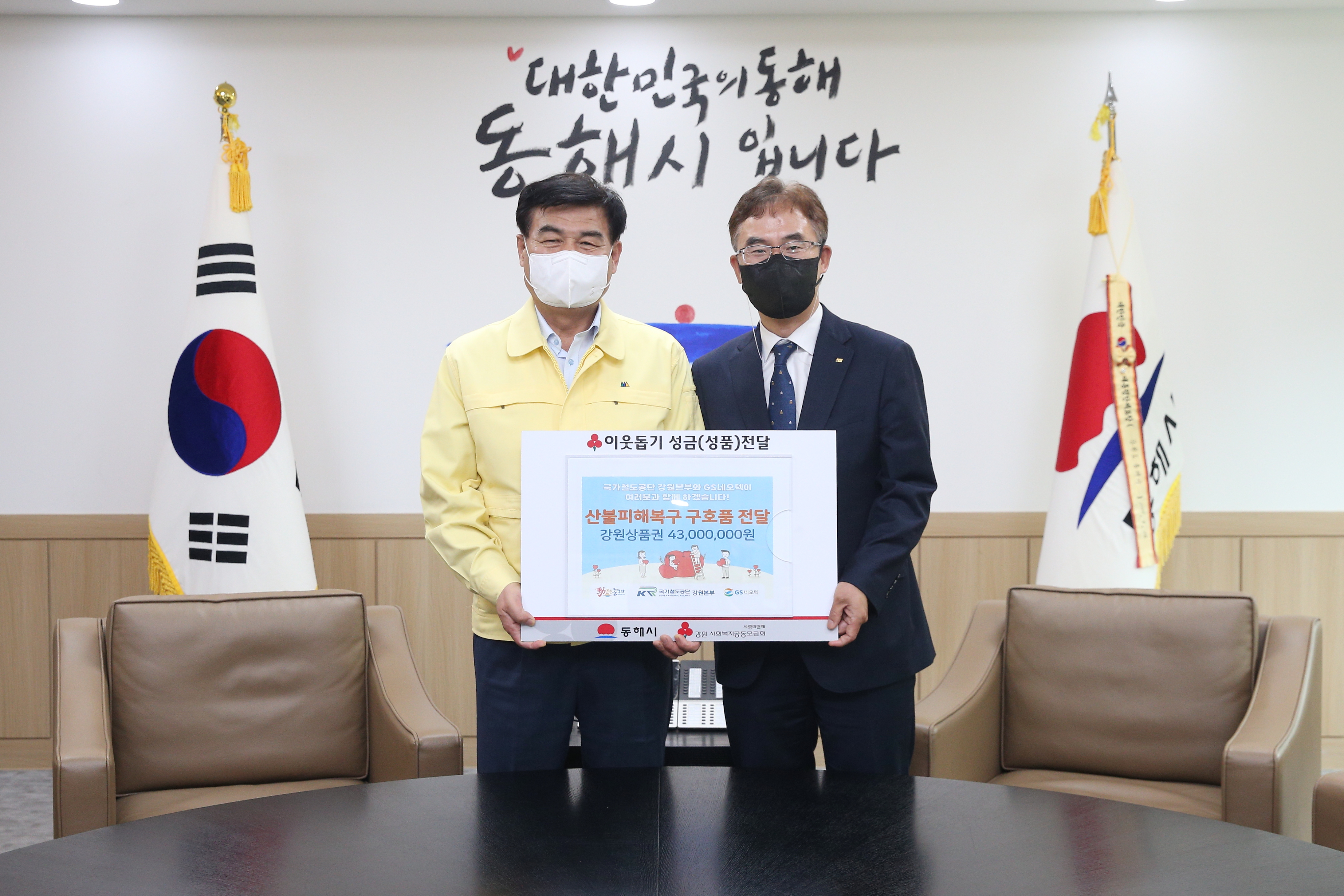 [강원사회복지신문 홍기한 기자]=동해시 산불피해 이주민 지원을 위한 도움의 손길이 지속되고 있다. 지난 4월 25일 국가철도공단 강원본부(본부장 양인동)와 GS네오텍은 동해시청을 방문하여 산불피해 복구 구호품으로 43백만원 상당 강원상품권을 전달했다. 양인동 강원본부장은 "3년전 화마의 아픔이 잊혀지기도 전에 또 ...