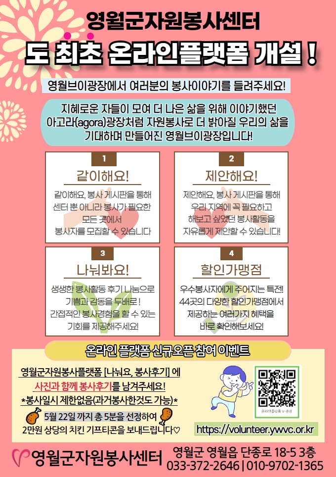 [강원사회복지신문 이정환 기자]=영월군자원봉사센터는 지난 4월 25일 온라인플랫폼(명칭:영월브이광장)을 신규 오픈했다.(https://volunteer.ywvc.or.kr/). 특히 이번에 신설된 온라인 플랫폼은 도내 센터 최초의 시도로 지역 자원봉사의 활성화를 일으킬 혁신적인 시도로 보인다. 봉사를 희망하는 지역민들에게는 현재 진행...