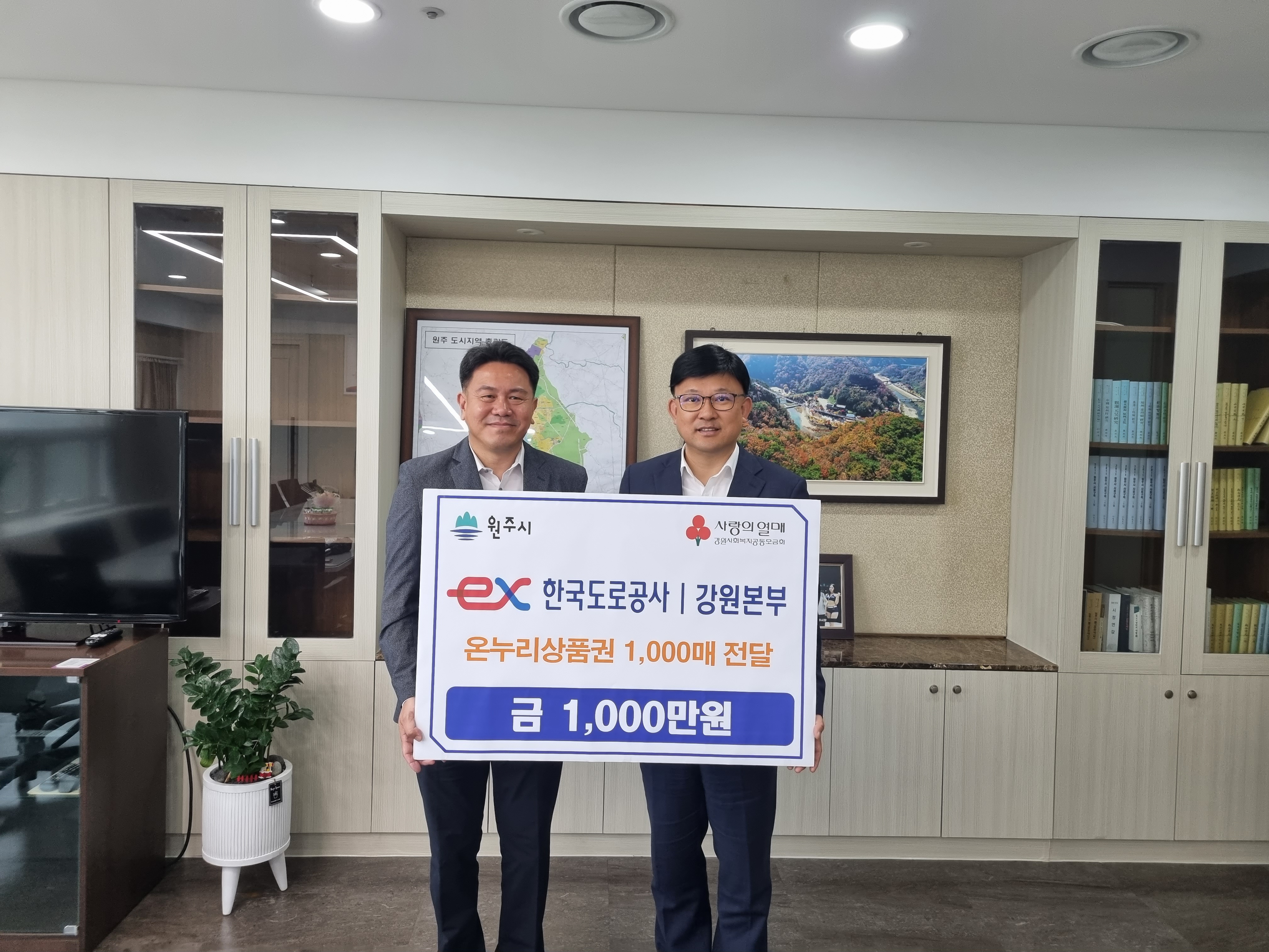 [강원사회복지신문 최재석 기자]=한국도로공사 강원본부는 지난 9월 26일 원주시청을 방문하여 온누리상품권 1,000만 원을 기부했다. 후원품은 사회복지공동모금회를 통해 원주시 소재 사회복지기관(6개소)에 전달되었다.