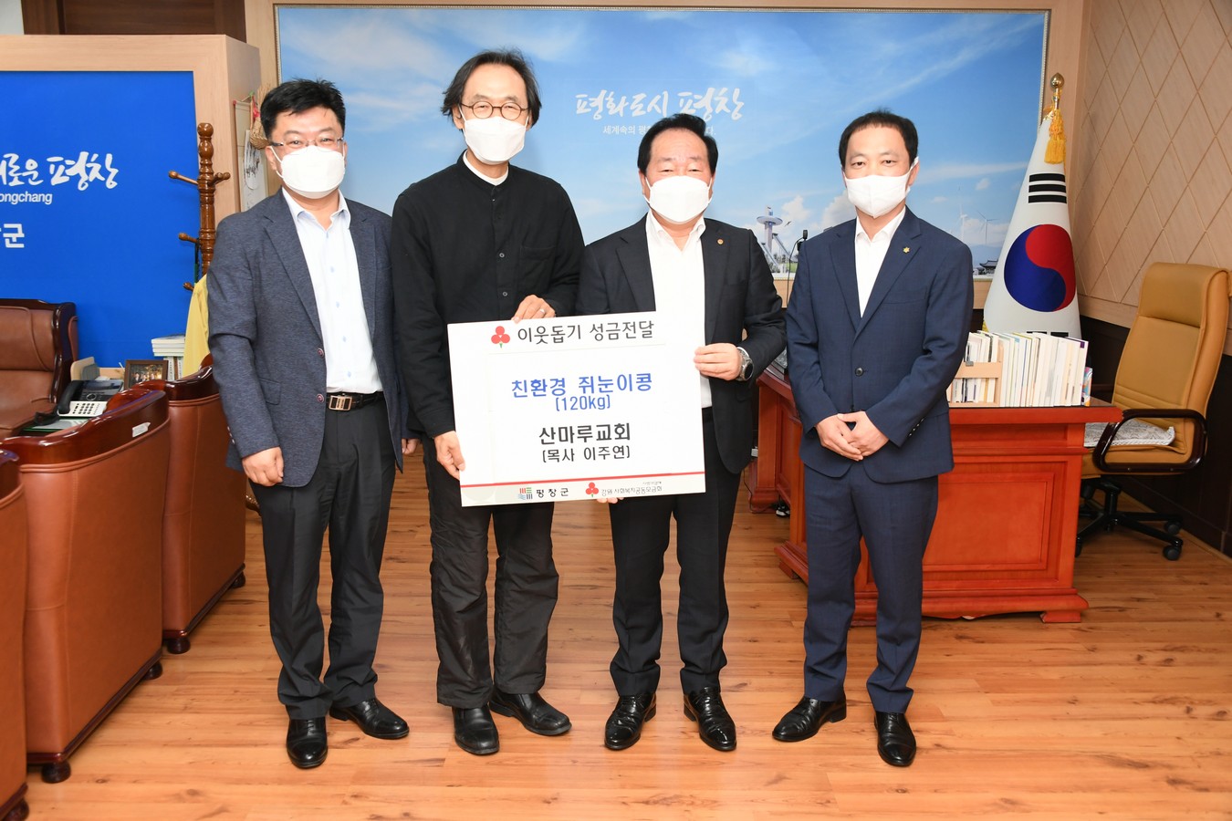 [강원사회복지신문 이정환 기자]=평창군 산마루교회(목사 이주연)는 지난 4월 19일 저소득층이 먹을 수 있도록 해달라며 친환경 쥐눈이콩 120kg(환가액 약120만원 상당)을 평창군을 찾아 기탁했다. 이날 기탁한 쥐눈이콩은 이주연 목사가 직접 농사를 지어 생산된 친환경농산물로, 평창지역자활센터에서 운영 중인 행복도시락...