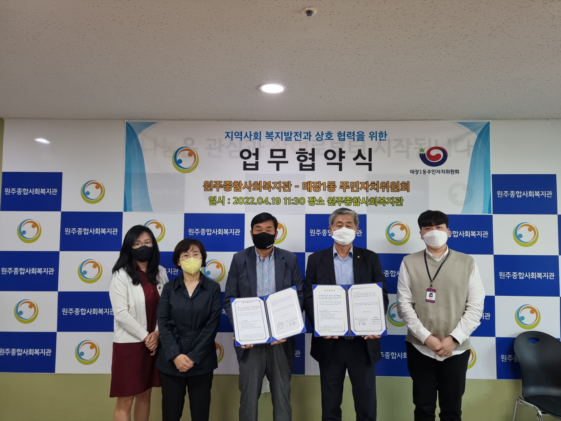 [강원사회복지신문 서은진 기자]=원주시 태장1동 주민자치위원회(위원장 고영식)는 지난 4월 19일 원주종합사회복지관(관장 이만복)과 지역사회 복지 발전 및 지역공동체 형성을 위한 업무협약을 체결했다. 주요 협약 내용으로 ▲사회복지서비스의 체계적인 연계 및 지원에 상호 협약 ▲자원 공유를 통해 상호 발전 및 지역사...