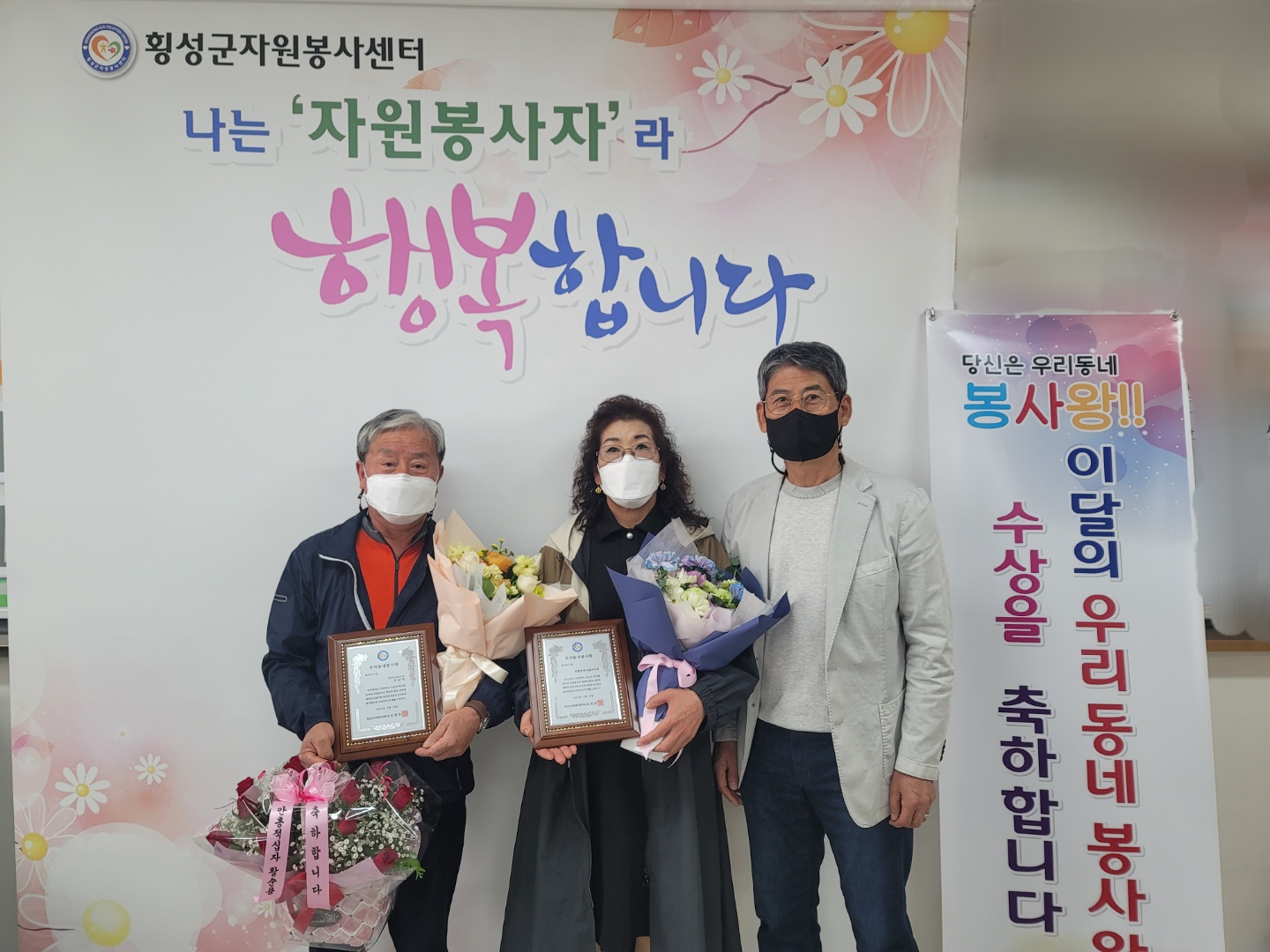 [강원사회복지신문 홍기한 기자]=횡성군자원봉사센터(센터장 조원문)는 4월 우리동네봉사왕(안흥면)에 개인으로 조남국 봉사자, 단체로는 안흥면새마을부녀회를 선정하여 지난 4월 18일(월) 횡성군자원봉사센터 사무실에서 시상식을 가졌다. 개인으로 선정된 조남국 봉사자는 코로나19관련 '예방접종지원', '방역캠페인' 활동...
