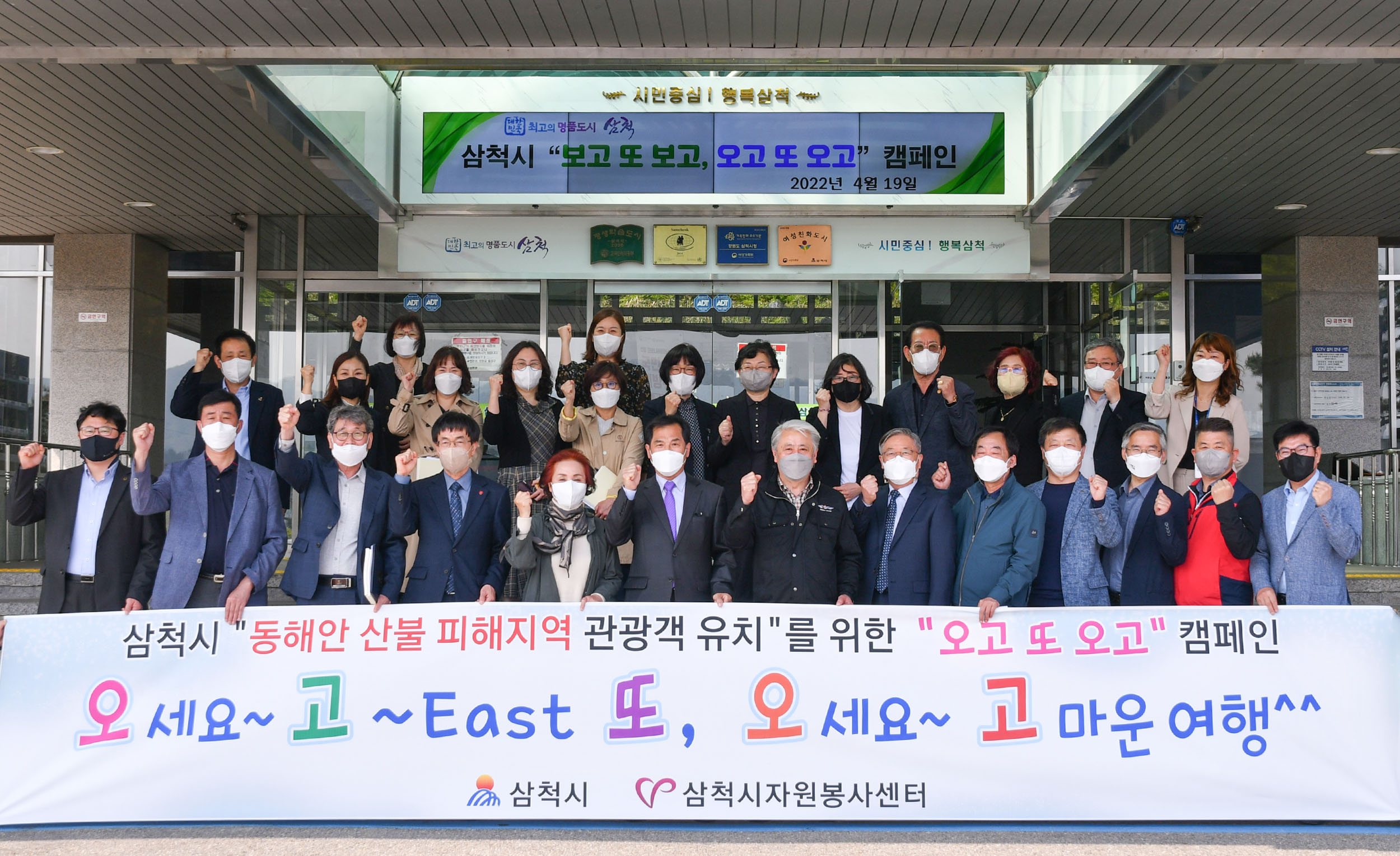 [강원사회복지신문 이정환 기자]=삼척시와 삼척시자원봉사센터는 지난 4월 19일(화) 삼척시청 앞에서 최근 대형 산불로 큰 피해를 입은 경북, 강원 동해안 지역 여행 독려를 위해 '오고 또 오고' 캠페인을 진행했다. 이 캠페인은 본격적인 나들이 철을 맞은 시점에 산불 피해지역 여행은 행여나 민폐가 될까 싶어 발길을 돌린...