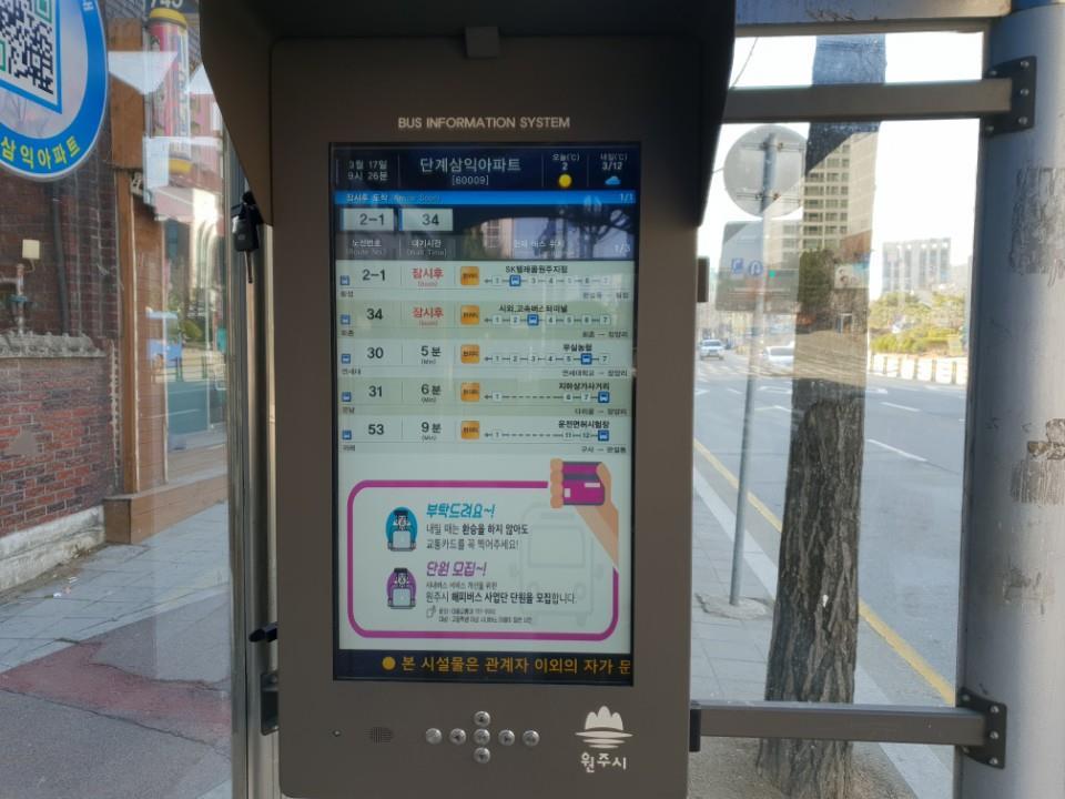 [강원사회복지신문 홍기한 기자]=버스정보 안내 단말기, 읍면 지역 7대 포함 총 10대 추가 설치 원주시는 시민들의 대중교통 이용 편의를 위해 버스정보 안내 단말기 10대를 설치하고 5월부터 정상 운영한다고 밝혔다. 특히 그동안 도심부 위주로 설치했던 것에서 벗어나 문막 후용리, 소초 회촌, 흥업 미촌 등 읍면 지역 버...