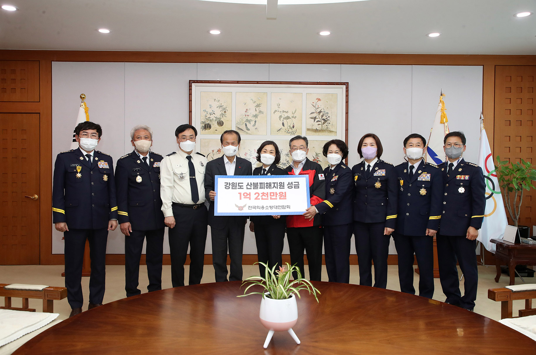 [강원사회복지신문 서은진 기자]=전국의용소방대연합회(회장 김미경)는 지난 4월 12일 14시에 강원도청 통상상담실에서 동해안 산불로 피해를 입은 지역주민에 대한 1억 2천만원의성금을 전달하였다. 전국의용소방대에서는 산불피해를 입은 강원도민을 위하여 지난 한달 동안 전국의용소방대원에게 특별 성금을 모금했다. 전...