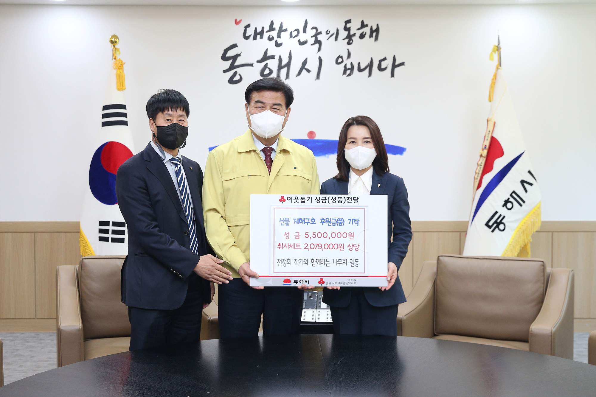[강원사회복지신문 김종한 기자]=동해시(시장 심규언)에 산불 피해 복구를 위한 따뜻한 기부행렬이 이어지고 있다. 전정희 작가와 함께하는 나무회 일동에서 500만원의 성금과 200여만원 상당의 취사세트, 덕윤개발(주) 1,000만원, 동해전문건설협회 3,500만원, 원주시 학원연합회 2,775,000원, 춘천시 학원연합회에서 100만...