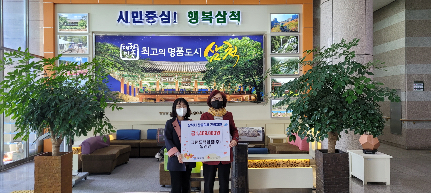 [강원사회복지신문 김종한 기자]=그랜드백화점(주) 일산점은 지난 3월 23일(수) 협력업체와 바자회 행사 진행 후 바자회 수익금 1,409,000원을 지난 4월 7일 삼척시 산불피해 지원을 위한 성금으로 기탁하였다. 이번 그랜드백화점의 바자회 행사는 협력업체의 순수 기증 상품 판매 수익금으로 마련되었다.