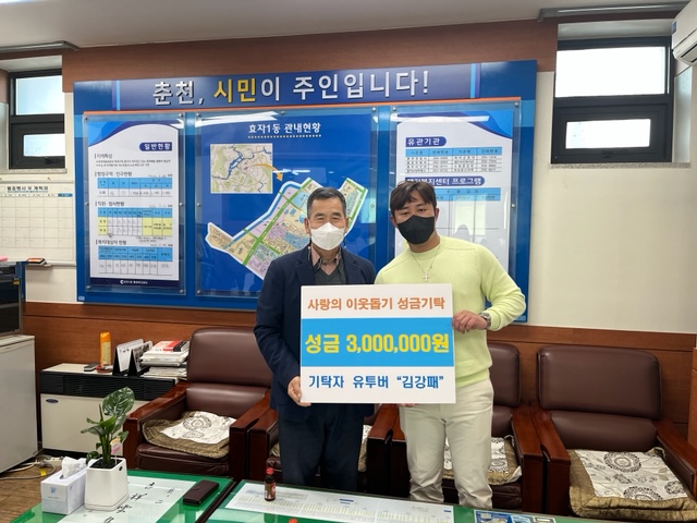 [강원사회복지신문 이정환 기자]=유튜버 김강패는 지난 4월 7일 춘천시 효자1동 저소득 가정에 성금 300만원을 기탁했다