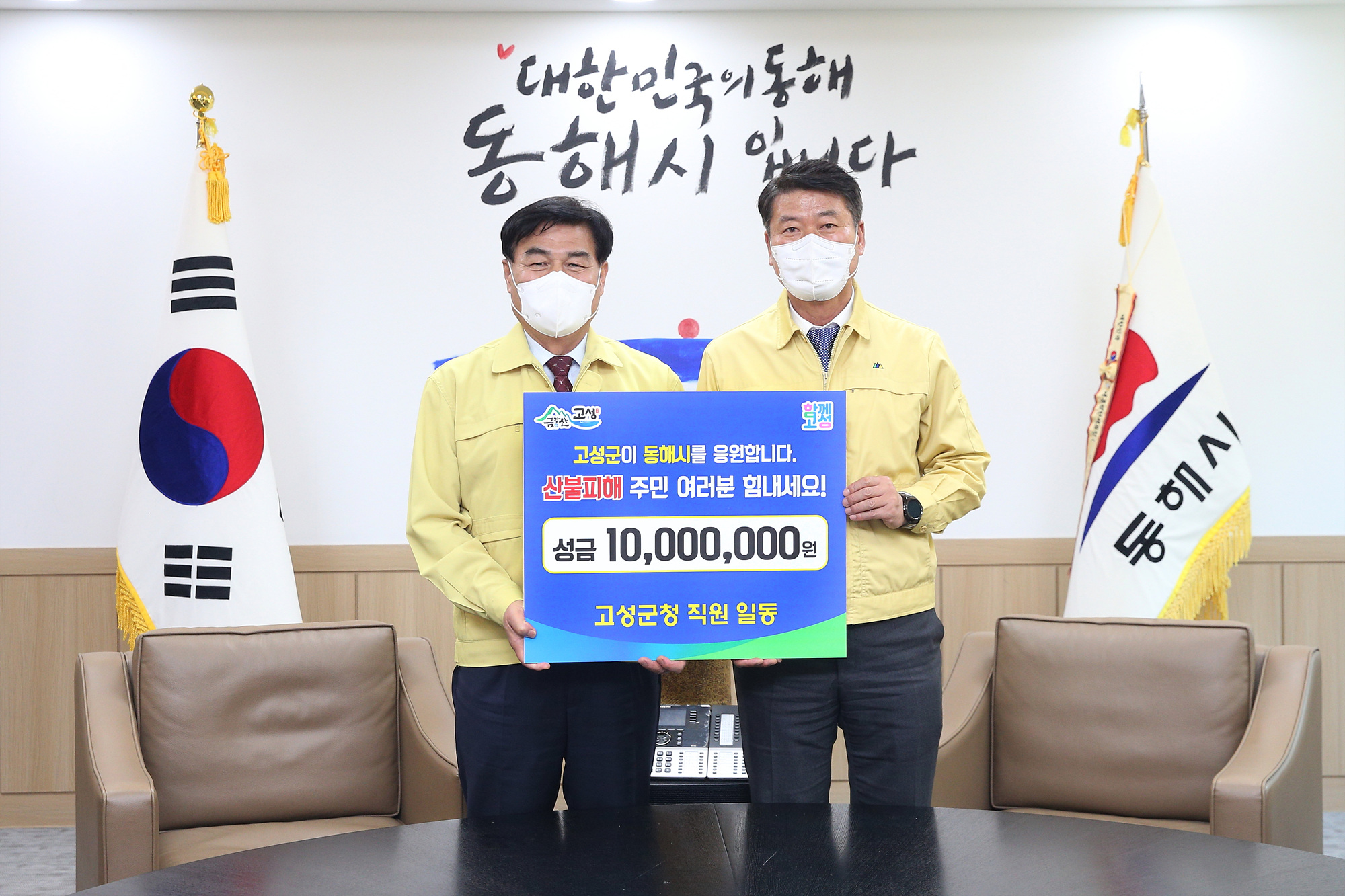 [강원사회복지신문 이정환 기자]=함명준 고성군수가 지난 4월 7일 동해시청을 방문해 고성군청 직원들이 마련한 산불피해 극복 성금 1,000만원을 기탁했다.