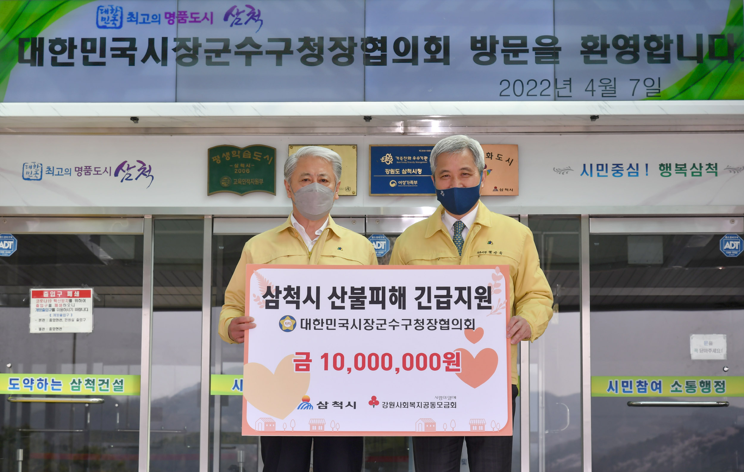 [강원사회복지신문 서은진 기자]=대한민국시장군수구청장협의회(회장 곽상욱 오산시장)는 지난 4월 7일 삼척시청을 방문해 산불피해 성금 1,000만원을 기탁하였다.