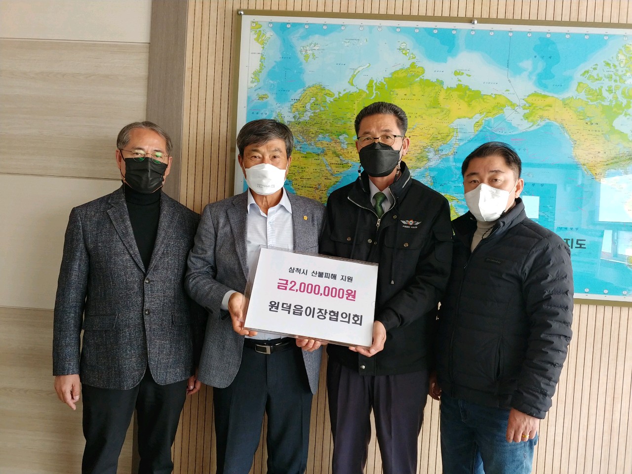 [강원사회복지신문 홍기한 기자]=삼척시 원덕읍이장협의회(협의회장 민만기)가 지난 4월 7일(목) 15시 원덕읍 행정복지센터에서 삼척시 산불 이재민 지원을 위한 성금 2백만 원을 기탁했다. 이날 전달식에는 민만기 원덕읍이장협의회 협의회장과 이광희(옥원2리 이장) 사무국장, 이재천 호산1리장이 함께 참석했다.