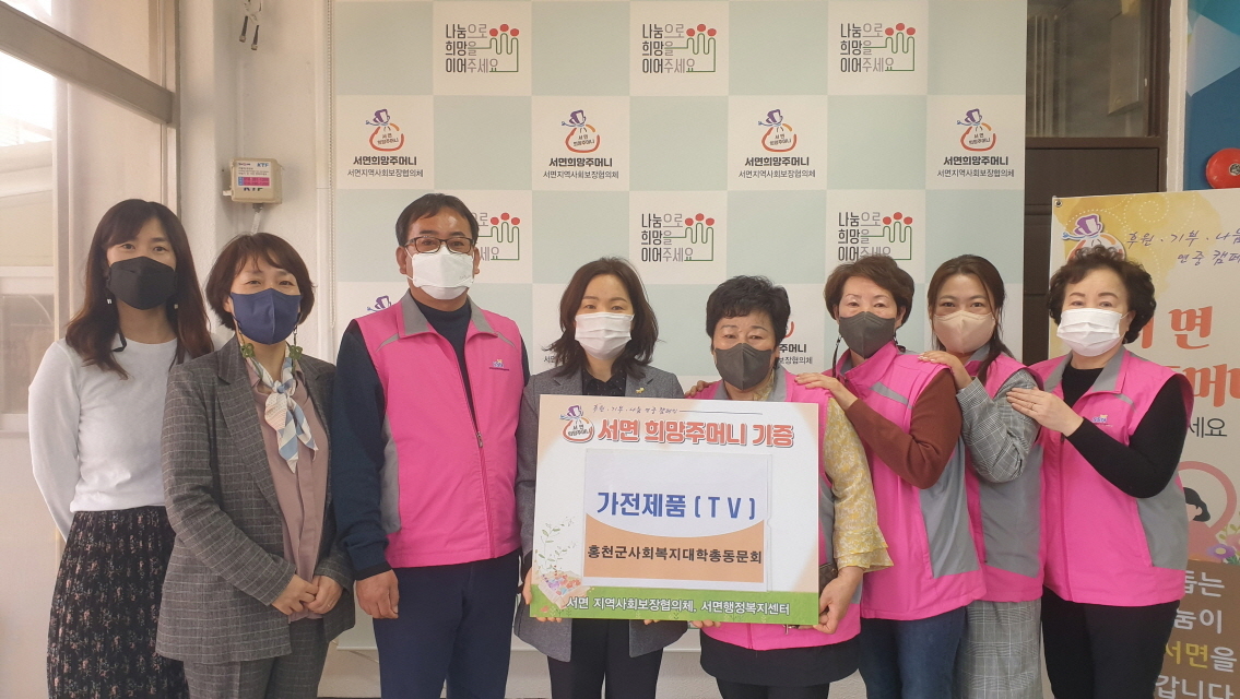 [강원사회복지신문 서은진 기자]=홍천군 사회복지대학 총동문회(회장 김혜경)는 지난 4월 6일 홍천군 서면 행정복지센터를 방문, 어려운 이웃에게 전달해 달라며 TV 1대를 기탁했다. 전달된 TV는 모곡리에 홀로 거주 중인 70대 어르신에게 전달될 예정이다. 김혜경 회장은 "작은 물품이지만 어려운 이웃에게 조금이라도 도움...