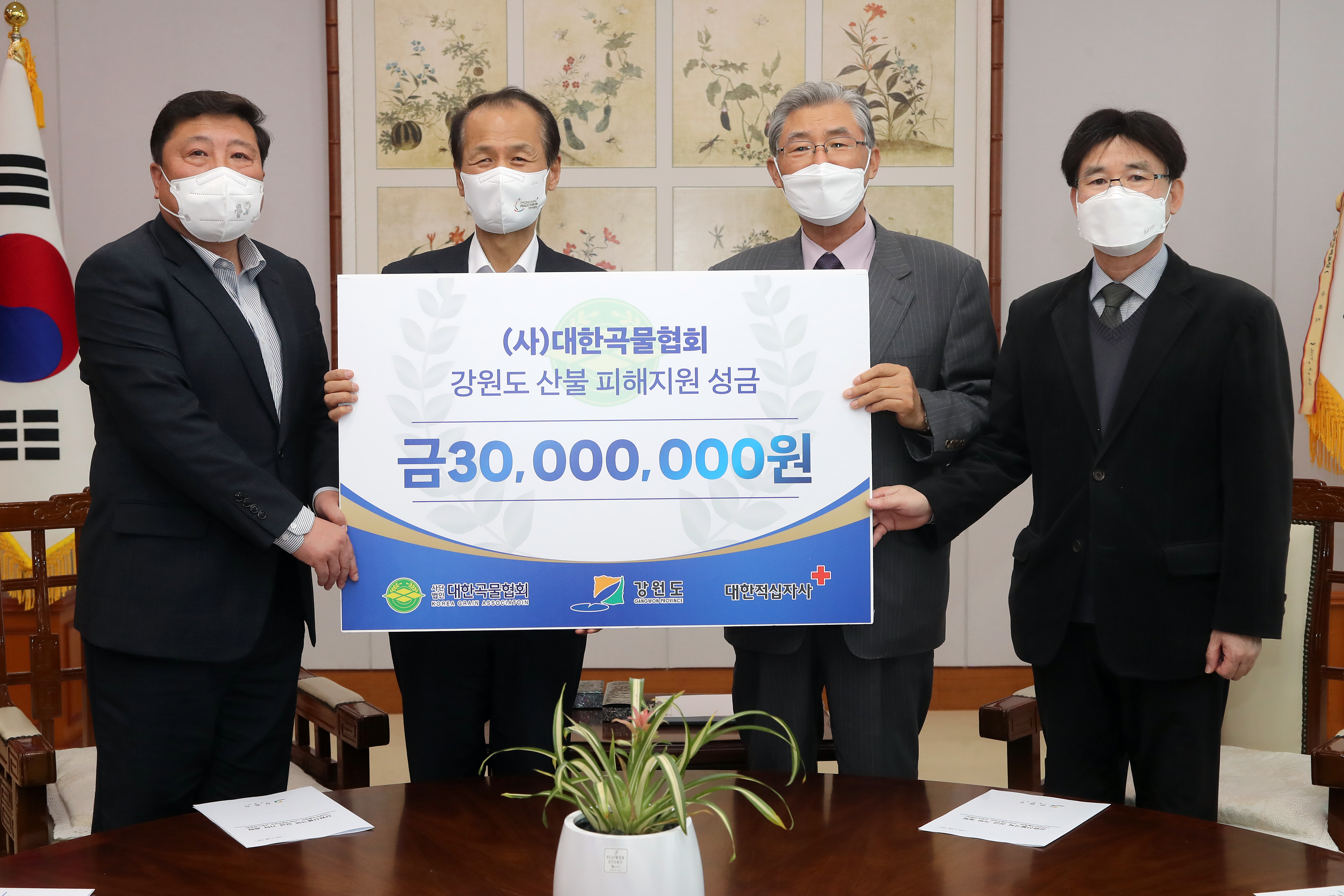 [강원사회복지신문 서은진 기자]=(사)대한곡물협회(회장 박영식, 강원도지회장 함상옥)는 지난 4월 4일 오후 3시 강원도청 통상상담실에서 강원도 산불피해 지역의 피해복구 및 이재민을 돕기 위한 성금 3천만원을 강원도(강원도지사 최문순)에 전달했다. 이번 성금은 (사)대한곡물협회 14개 시·도지회에서 산불로 피해를 입...