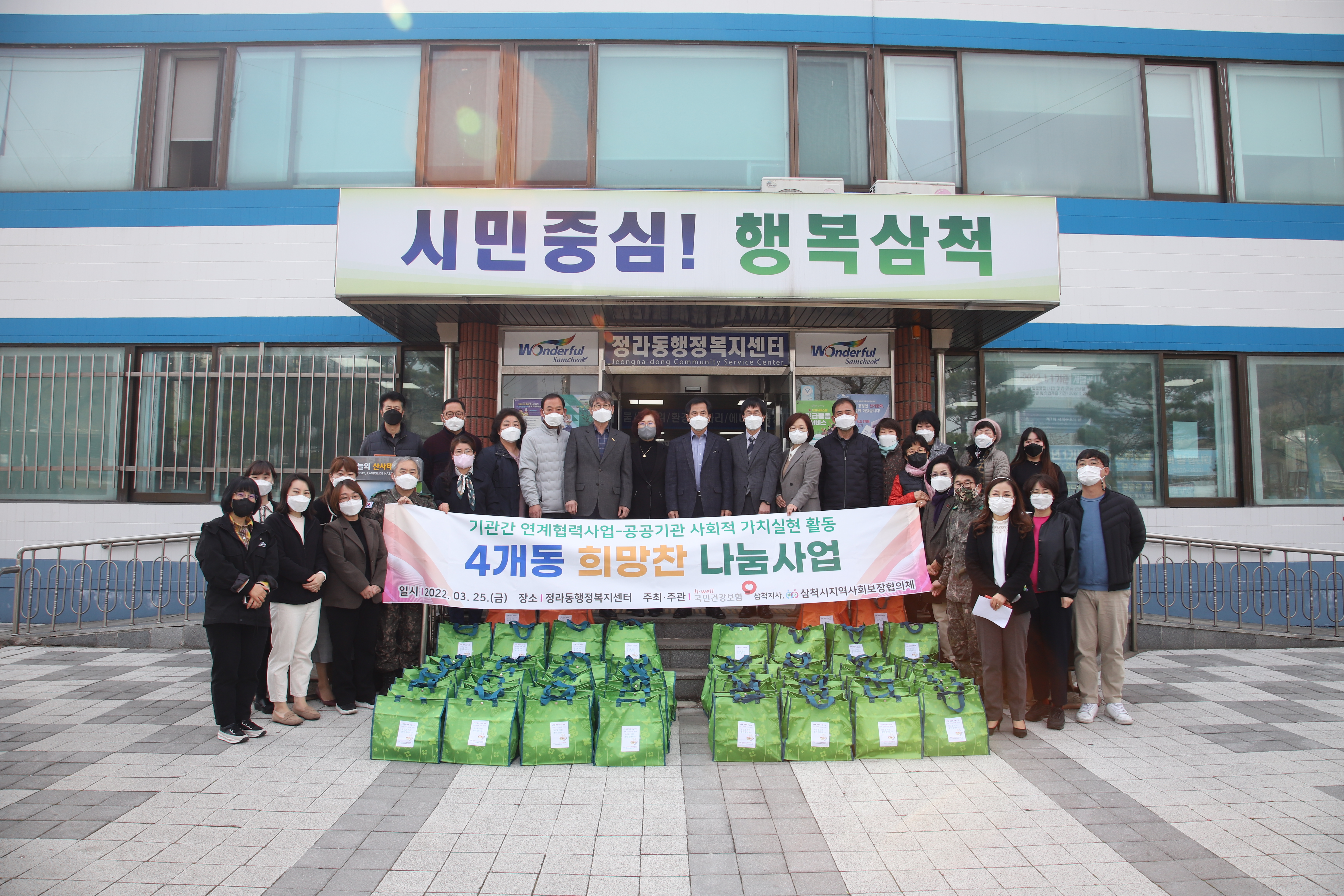 [강원사회복지신문 이정환 기자]=삼척시 지역사회보장협의체는 지난 3월 24일과 25일 이틀 동안 관내 복지사각지대 지역주민들 60가구를 대상으로 '4개동 희망찬(饌-밑반찬) 나눔사업'을 진행했다. 본 사업은 ▲삼척시·삼척시 지역사회보장협의체가 주관하고 ▲관내 4개동(남양동, 성내동, 교동, 정라동) 지역사회보장협의체...