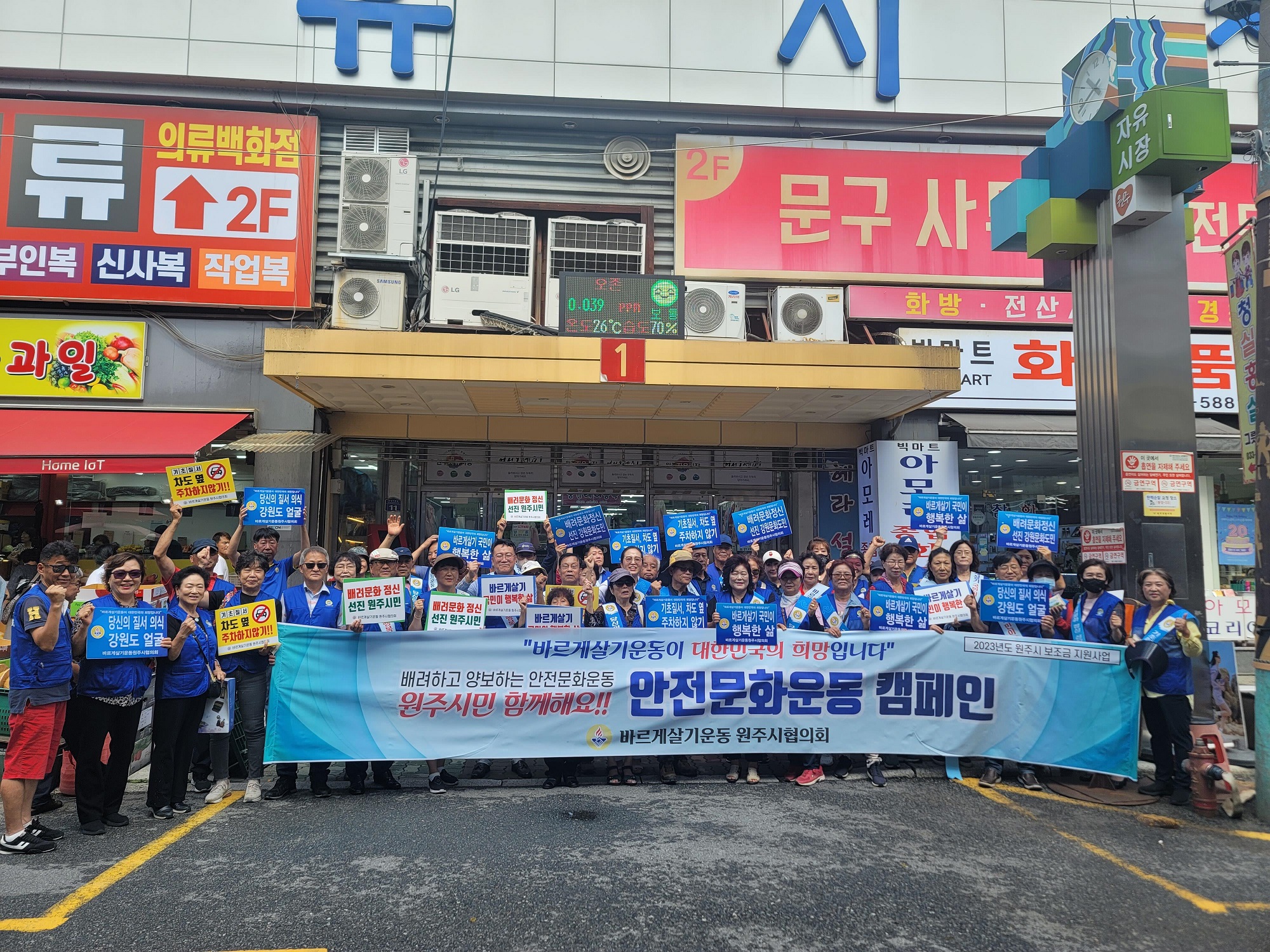 [강원사회복지신문 최재석 기자]=바르게살기운동 원주시협의회(회장 황춘환)는 지난 9월 18일 원주 중앙시장 일원에서 안전문화 캠페인을 실시했다. 이날 바르게살기운동 원주시협의회는 '안전문화운동 및 기후변화 대응 실천 결의문'을 낭독하고, 시민들에게 안전문화 홍보 물티슈를 배부하며 캠페인을 펼쳤다.