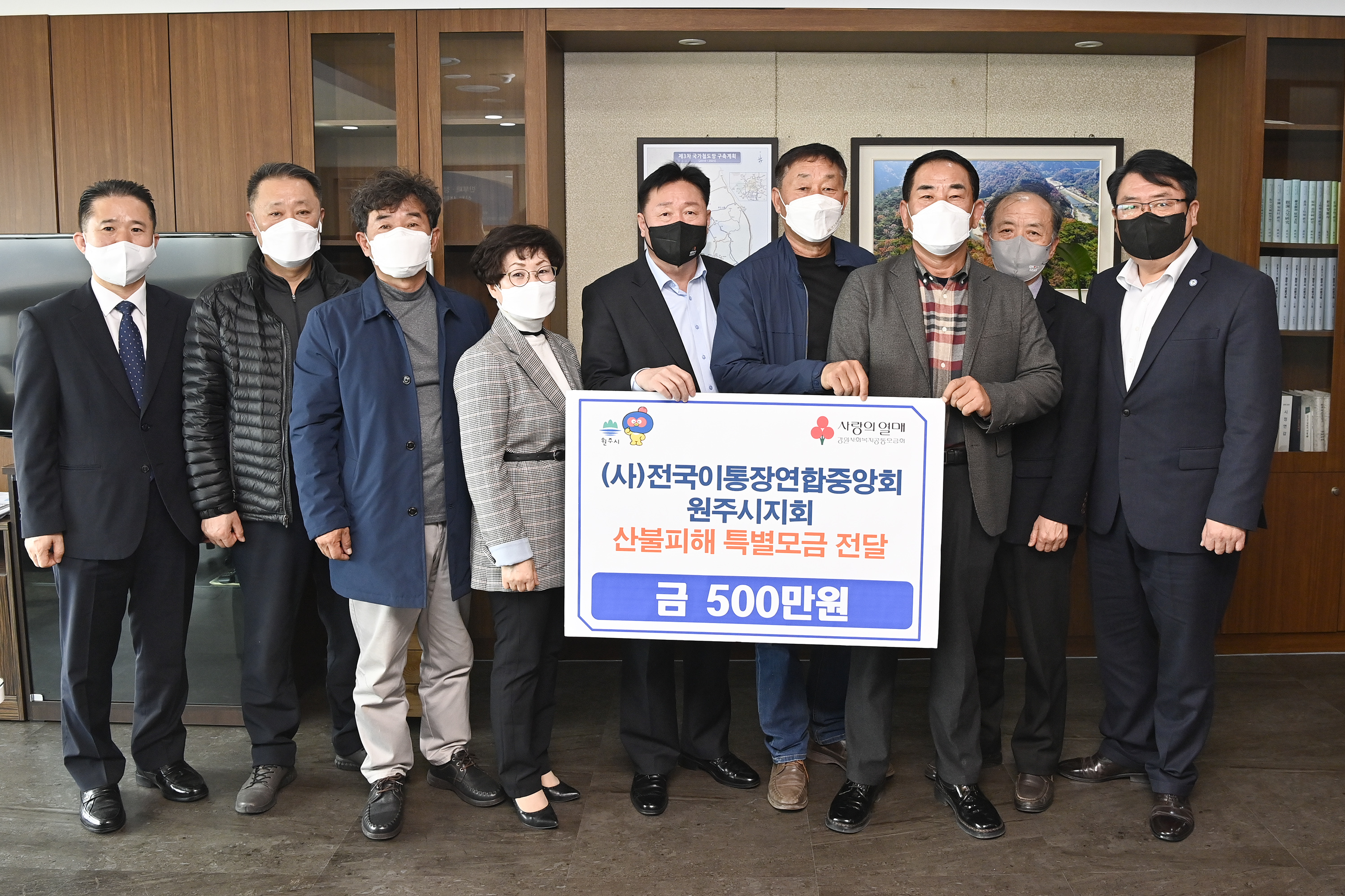 [강원사회복지신문 서은진 기자]=(사)전국이·통장연합중앙회 원주시지회(회장 김정윤)는 지난 3월 25일 원주시청 부시장 집무실을 방문해 강원 산불 피해 특별모금 500만 원을 전달했다. 김정윤 회장은 "갑작스러운 산불로 큰 피해를 겪은 이재민분들에게 조금이나마 위로와 도움이 되길 바란다."라며, "하루빨리 일상으로 ...