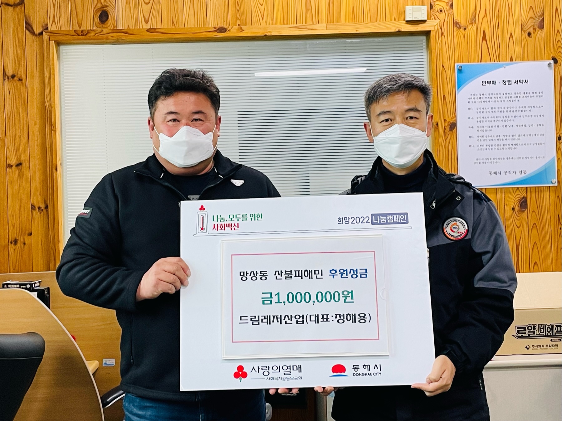 [강원사회복지신문 서은진 기자]=망상해수욕장상가번영회(회장 권석문)와 드림레저산업(대표 정해용)에서 동해시 망상동행정복지센터를 방문해 이번 산불로 피해를 입은 가구에 조금이나마 도움이 되기를 희망한다며 각 100만원씩 총 200만원의 성금을 후원했다.
