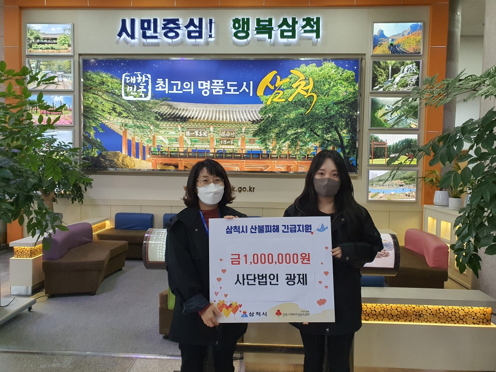 [강원사회복지신문 홍기한 기자]=사단법인 광제에서 지난 3월 23일 삼척시 산불피해 복구를 위한 성금 1,000,000원을 기탁하였다. 사단법인 광제는 지난 2020년 용인시 결식아동과 저소득층 가정에 연탄을 기부하는 등 기부활동을 펼쳐오고 있다.
