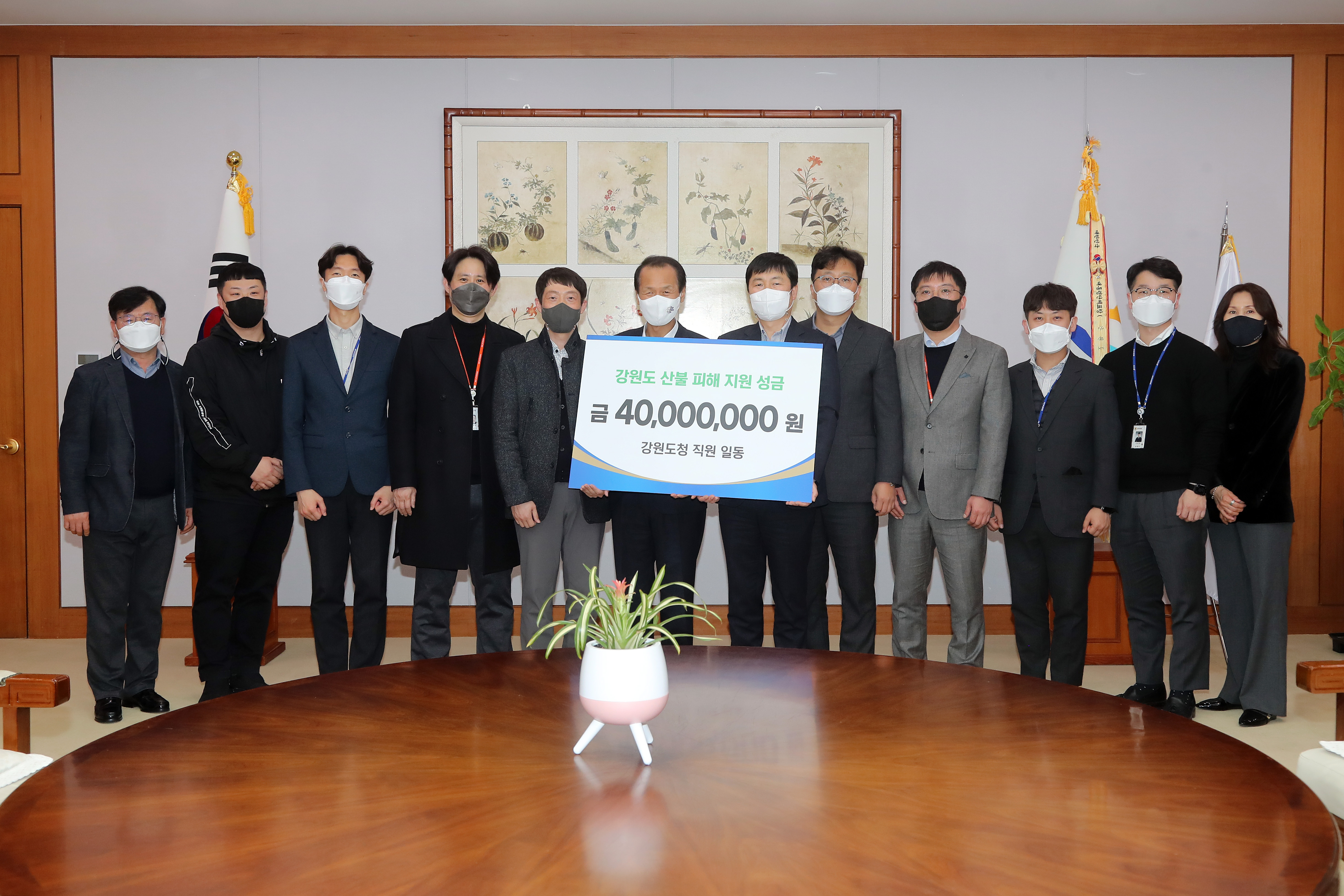 [강원사회복지신문 홍기한 기자]=강원도청 직원들은 지난 3월 21일 평소 이웃사랑과 나눔실천을 위해 자발적으로 적립한 기부금 4천만 원을 산불 피해 지역의 복구를 위해 강원도지사에게 전달하였다.