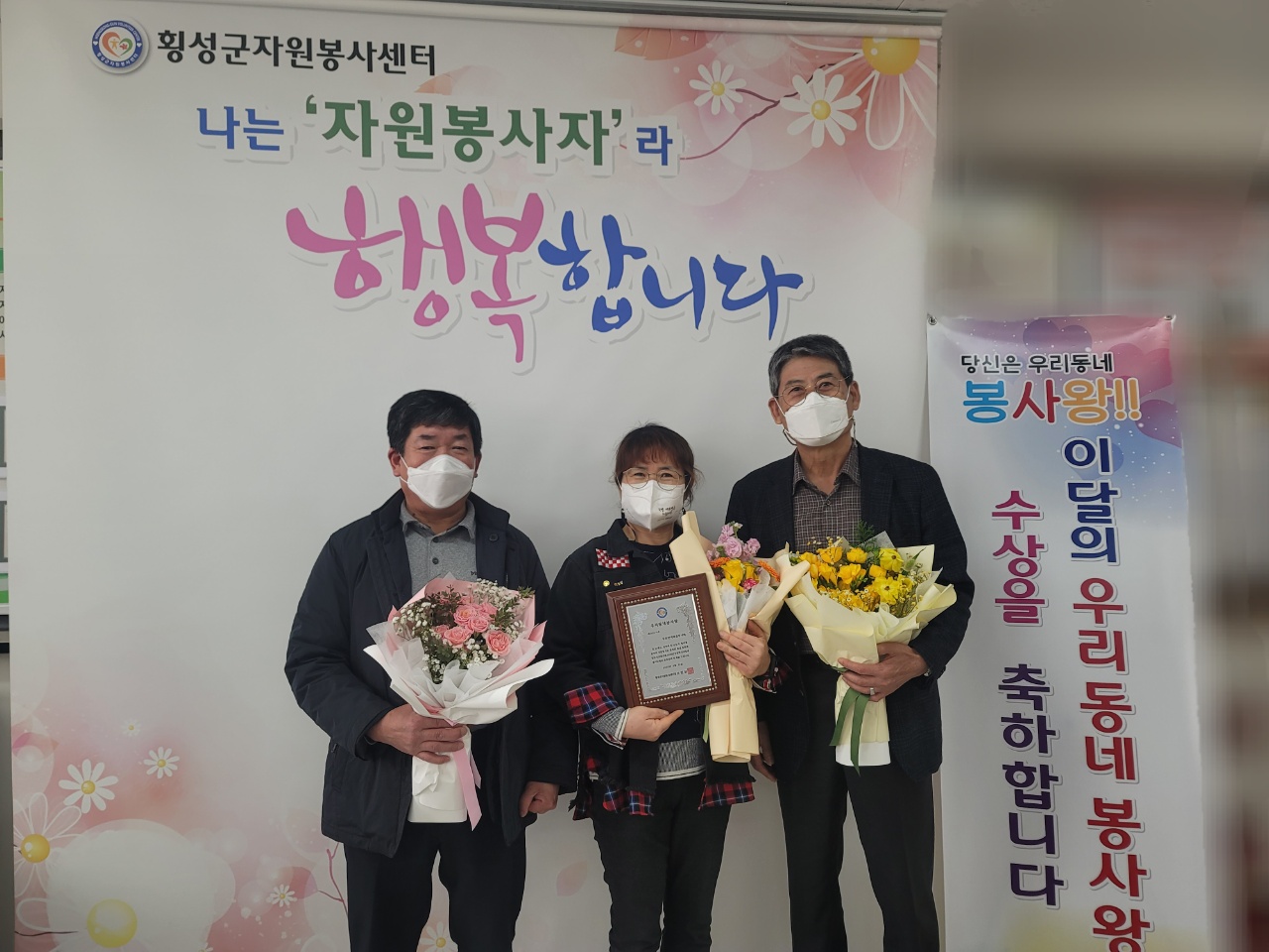 [강원사회복지신문 홍기한 기자]=횡성군자원봉사센터(센터장 조원문)는 3월 우리동네봉사왕(우천면)에 개인으로 류재인 봉사자, 단체로는 우천면새마을부녀회를 선정하여 지난 3월 21일(월) 횡성군자원봉사센터 사무실에서 시상식을 가졌다. 개인으로 선정된 류재인 봉사자는 '코로나19 예방접종 자원봉사'와 '농촌일손돕기'...