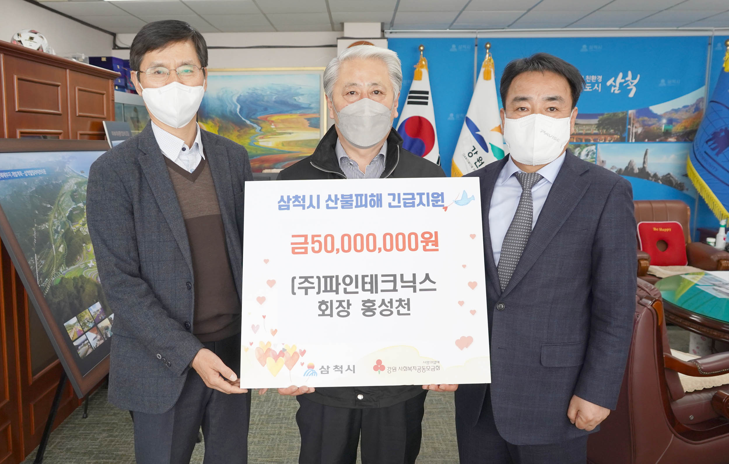 [강원사회복지신문 서은진 기자]=(주)파인테크닉스 회장 홍성천은 지난 3월 21일 오후 1시 삼척시청 시장 집무실에서 산불피해 주민들을 위해 써달라며 성금 5천만원을 삼척시장에게 전달했다.
