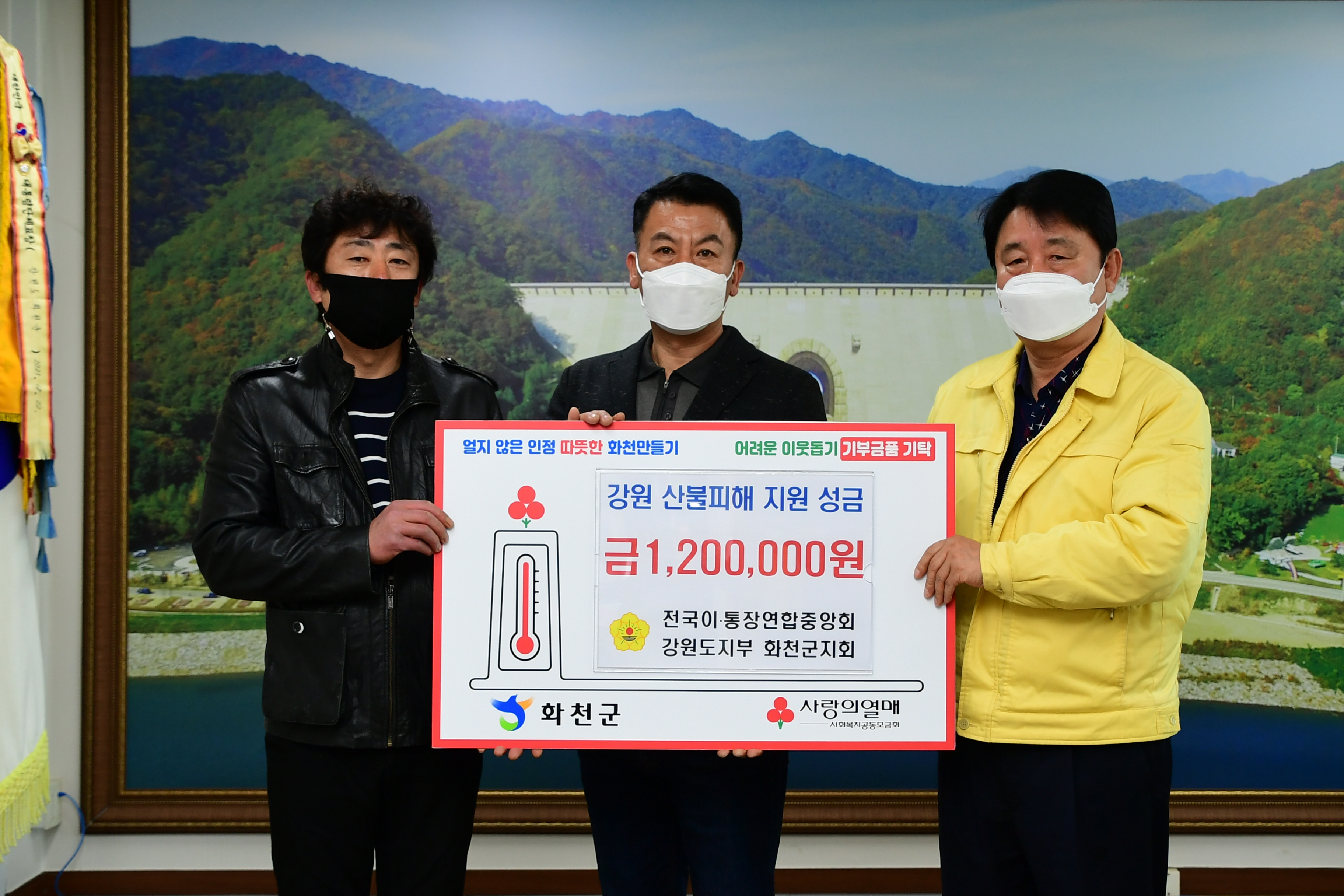 [강원사회복지신문 이정환 기자]=전국 이통장 연합중앙회 화천군지회(지회장:정상철)는 지난 3월 21일 최문순 화천군수를 방문해 강원산불 피해지원 성금 120만원을 기탁했다.
