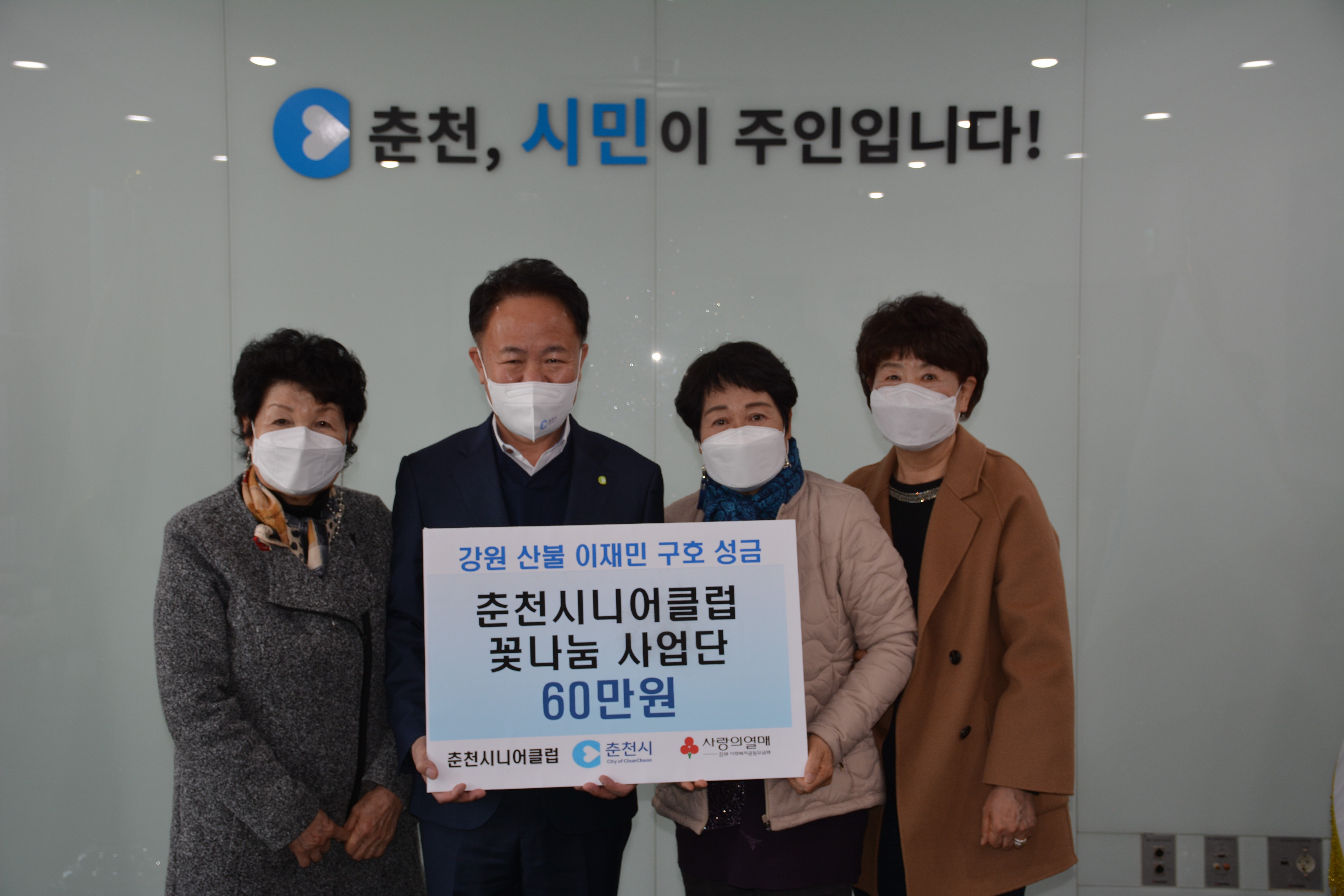 [강원사회복지신문 서은진 기자]=함께하는 꽃나눔 사업단(단장 길근수·이영옥)은 지난 3월 21일 춘천시청 접견실에서 강원 산불 이재민 구호 성금 60만원을 춘천시정부에 전달했다.