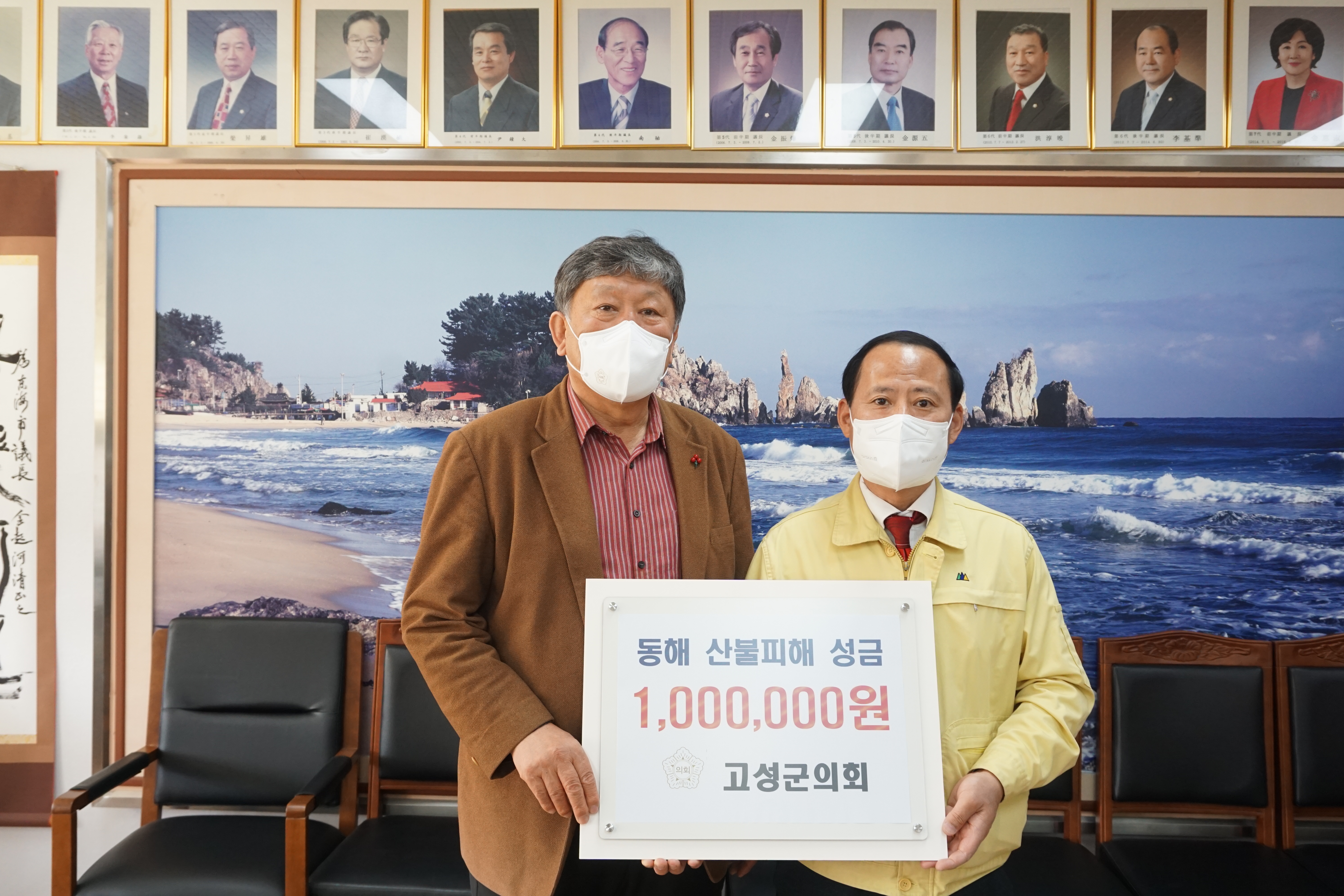 [강원사회복지신문 홍기한 기자]=고성군의회(의장 함형완)는 지난 3월 15일 강릉 옥계 산불 발생과 관련, 동해시의회(의장 김기하)를 방문해 동해 산불 피해 복구와 이재민 지원을 위해 써달라며 복구지원 성금 100만원 상당 기탁금을 전달했다.