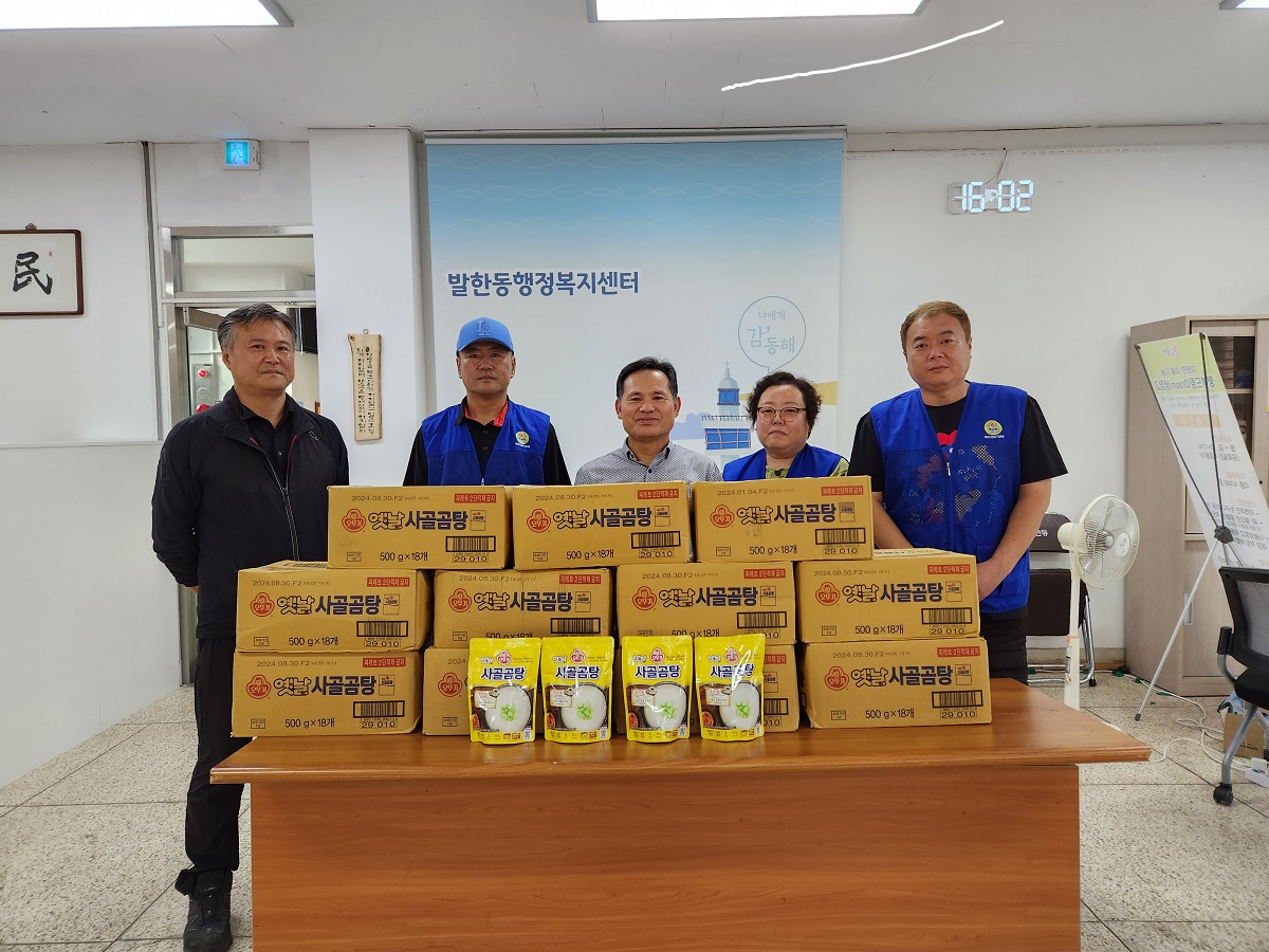 [강원사회복지신문 홍기한 기자]=동해시 발한동바르게살기위원회(위원장 이광우)는 지난 9월 19일 발한동행정복지센터를 방문하여 추석맞이 후원물품(사골곰탕) 200개를 전달했다. 기탁한 물품은 관내 저소득층에게 전달될 예정이다.
