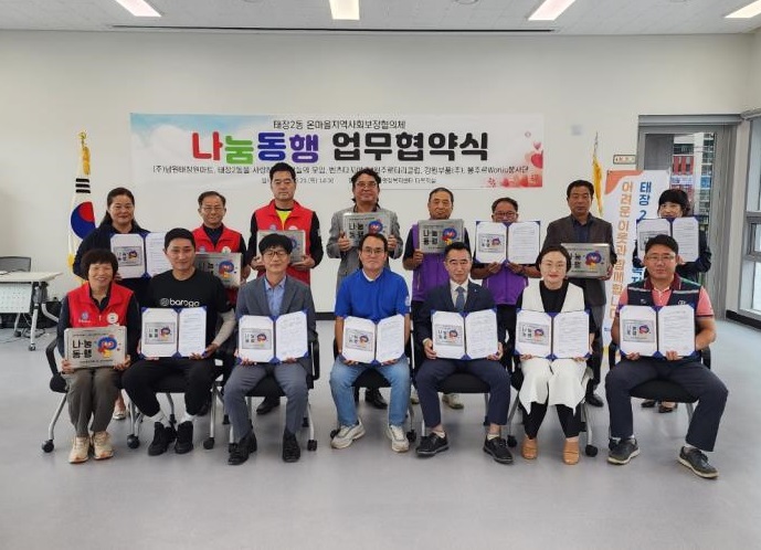 [강원사회복지신문 이정환 기자]=원주시 태장2동 지역사회보장협의체(위원장 양동수·오원택)는 지난 9월 21일 태장2동행정복지센터 3층 회의실에서 2023년 태장2동 온마을 만들기 프로젝트 '우리동네 행복동네! 나눔동행'업무 협약을 체결했다. 협약식에는 (주)남원태장원마트(대표 한창희)를 비롯해 태장2동을사랑하는사람...
