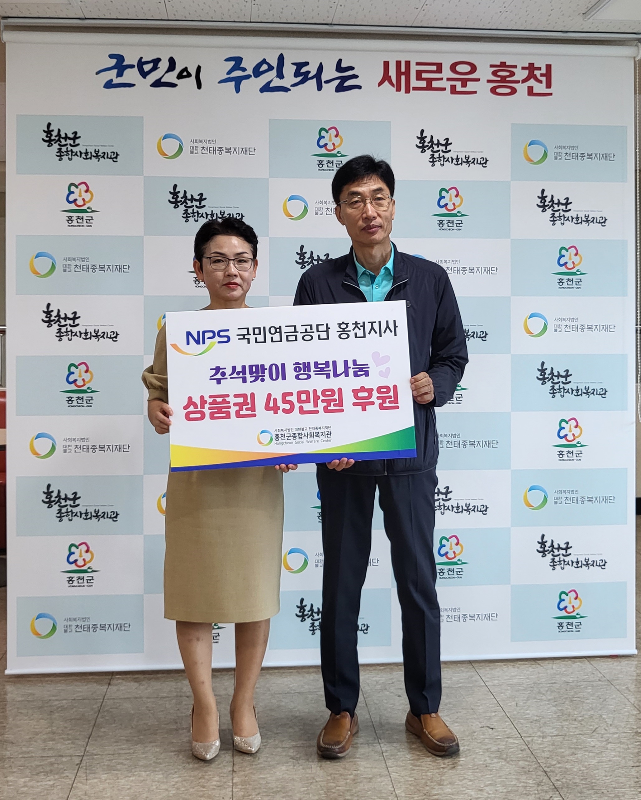[강원사회복지신문 김도연 기자]=국민연금공단 홍천지사(박성주 지사장)는 지난 9월 20일 한가위를 맞아 홍천군종합사회복지관에 상품권 45만원을 전달했다. 이번 상품권은 한가위를 맞이하여 지역 내 도움이 필요한 저소득 취약계층에 지원 될 예정이다. 복지관을 방문한 박성주 국민연금공단 지사장은 "지역 내 도움의 손길...