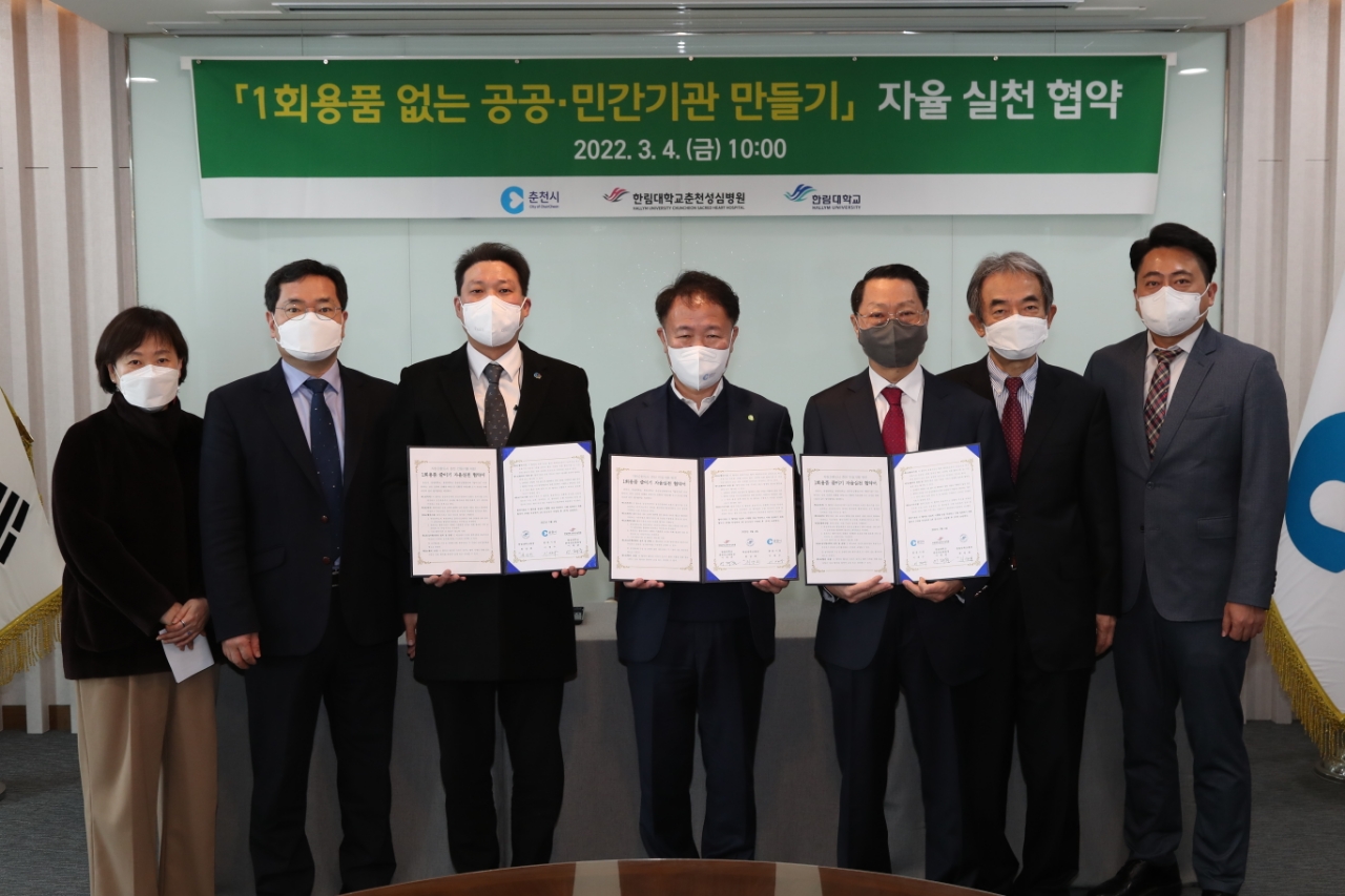 [강원사회복지신문 서은진 기자]=춘천시정부는 지난 3월 4일 접견실에서 한림대 춘천성심병원, 한림대와 1회용품 없는 공공·민간기관 자율 실천 협약을 맺었다.
